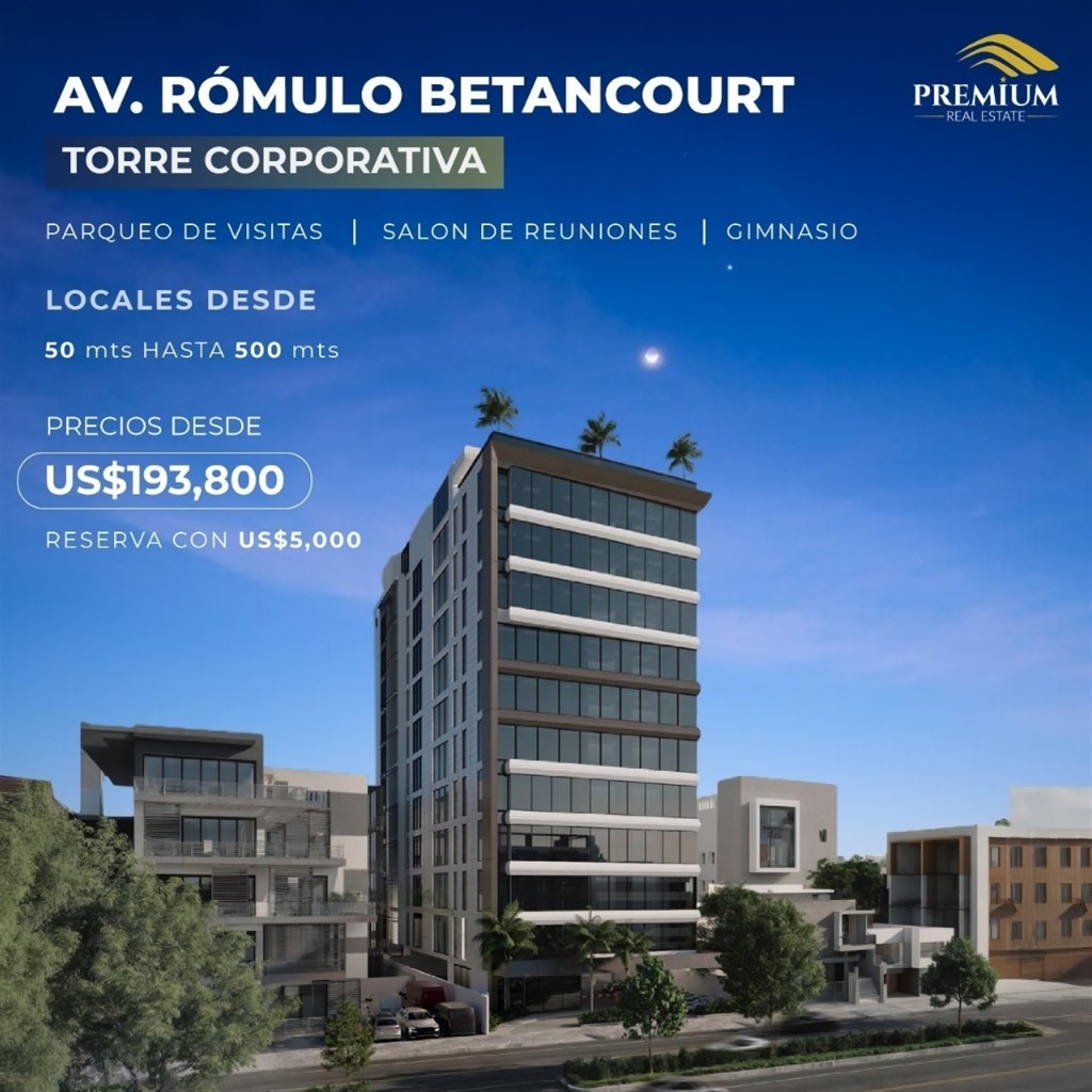 AVE. RÓMULO BETANCOURT CARACTERÍSTICAS: Locales desde 50 m2 2 parqueos por local 238 parqueos en total Parqueos de visita 3 ascensores Kitchenette en cada nivel Baños para Damas y Caballeros en cada nivel Acceso por dos calles Recepción Doble Altura Lobby Controles de acceso Equipos de Seguridad 24 horas Comedor de empleados Estar de choferes Oficina de administración Dos salones de conferencia Salón multiusos Gimnasio Terrazas en rooftop Desde: USD$193,800 Entrega: Sept. 2028