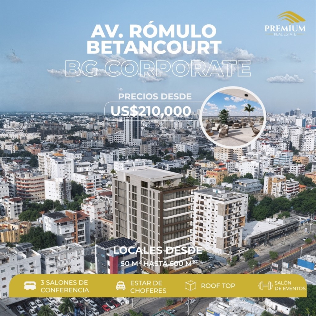 Av. Rómulo Betancourt??, Torre Corporativa. ¡Innovación, diseño y visión estratégica se unen en un proyecto único que transformará la manera de hacer negocios! CARACTERÍSTICAS: Locales desde 50 m2 2 parqueos por local 238 parqueos en total Parqueos de visita 3 ascensores Kitchenette en cada nivel Baños para Damas y Caballeros en cada nivel Acceso por dos calles Recepción Doble Altura Lobby Controles de acceso Equipos de Seguridad 24 horas Comedor de empleados Estar de choferes Oficina de administración Dos salones de conferencia Salón multiusos Gimnasio Terrazas en rooftop Desde: USD$210,000 Entrega: Sept. 2028