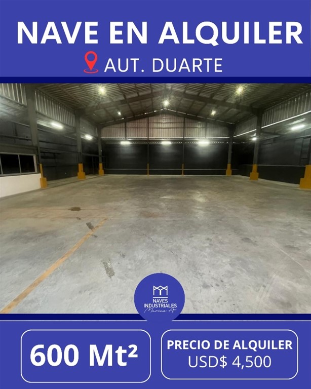Se alquila Nave Aut. Duarte »600 Mts² de Nave Precio de Alquiler: USD$ 4,500 / mes AMENIDADES: ** Facil Acceso ** Zona Industrial ** Doble Altura ** Oficina ** Kitchenette ** Baños ** Parqueos ** Luz y Agua 24/7 **Todos los servicios Otras opciones similares en la zona diversos metrajes y Precios. Naves Industriales Marino A. 829-838-8000 Tenemos 13 años en el ámbito comercial e Industrial contamos con una gran variedad de naves y solares de diversos tamaños precios y ubicaciones #navesindustriales #ventayrentadenaves #inversionesinteligentes #marinoa #navesindustrialesmarinoa