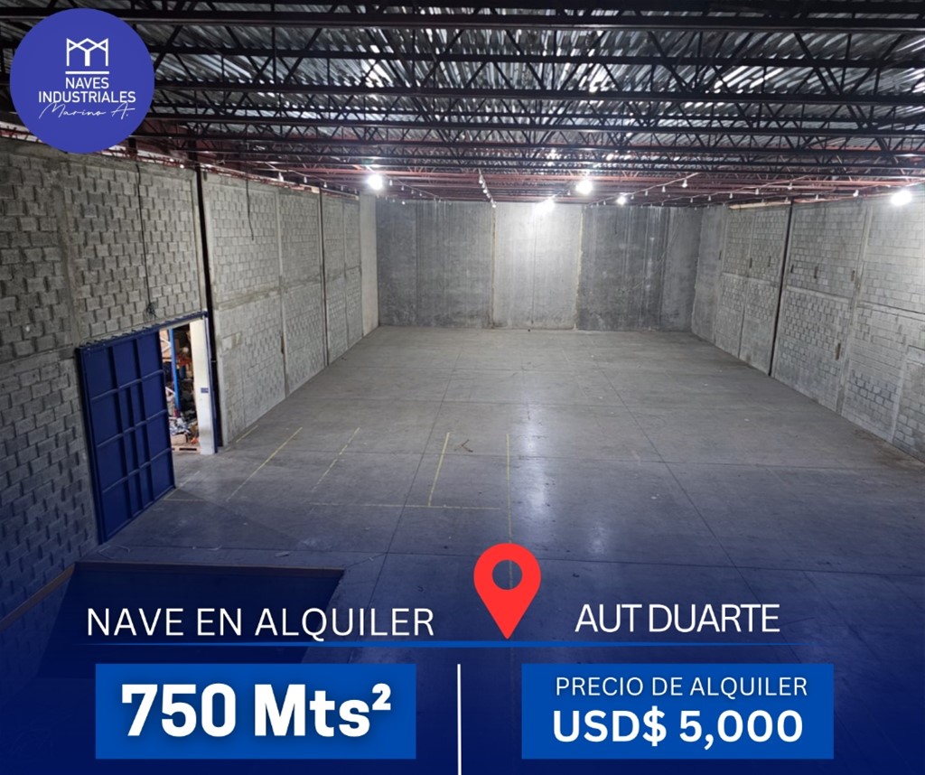 Nave en Alquiler ?? Aut Duarte?? »750 Mts² PRECIO DE ALQUILER: »US$ 5,000 AMENIDADES: ** Excelente Acceso ** Parque de Naves con Seguridad ** Doble altura **Oficinas en 2 niveles **Kitchenette ** Baños ** Atracadero bajo techo ** Parqueo ** Luz y Agua 24/7 **Todos los servicios Otras opciones similares en la zona diversos metrajes y Precios. Naves industriales MarinoA. 829-838-8000 Tenemos 13 años en el ámbito comercial e Industrial contamos con una gran variedad de naves y solares de diversos tamaños precios y ubicaciones