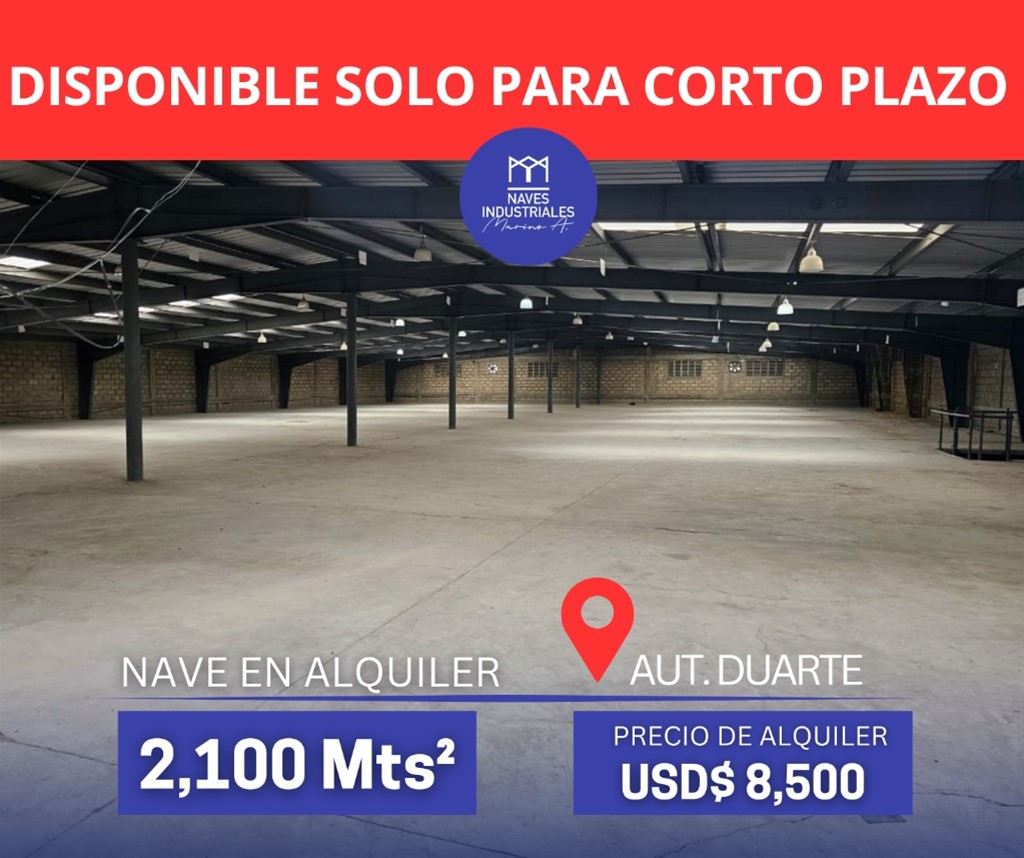 NAVE DE 2,100 MTS...AUT DUARTE??DISPONIBLE SOLO PARA CORTO PLAZO 2,100 mts² de Construcción Precio: USD$8,500 más itbis AMENIDADES: »Dos Niveles »Ascensor de carga »Oficinas »A 20 metros de la Aut Duarte »Rampa para Contenedores »Verja Perímetral »Baños?? »Parqueos ?? »Luz 24/7 »Todos los servicios *TIEMPO MAXIMO DE CONTRATO 8 MESES* Esta y otras opciones disponibles en la misma zona. Naves industriales MarinoA. 829-838-8000