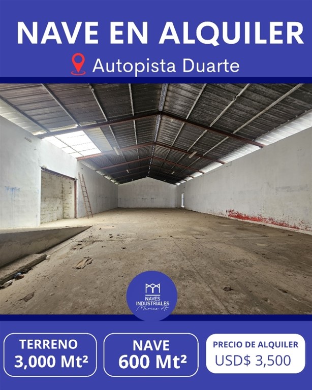 NAVE INDUSTRIAL EN ALQUILER Autopista Duarte – Con 3 accesos a vías principales 3,000 mts² de Terreno 600 mts² de Construcción Precio de Alquiler: USD$ 3,500 Amenidades: Verja de Seguridad Doble Altura Oficinas Kitchennete 3 Baños Cuarto Frío Cuarto de Seguridad Área de Almacén Cuarto de Planta Cisterna de 50,000 galones Pozos Amplio Parqueo Luz y Agua 24/7 Todos los Servicios También tenemos otras opciones en la zona con diversos metrajes y precios. Naves Industriales Marino A. 829-838-8000 13 años de experiencia en el ámbito Comercial e Industrial Ofrecemos una amplia variedad de naves y solares en distintas ubicaciones.