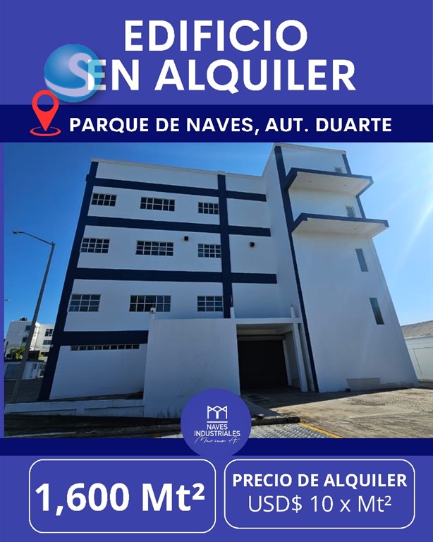 ?? Edificio en Alquiler – Parque de Naves, Aut. Duarte ¡El espacio perfecto para tu almacén o centro logístico! ?? Moderno edificio industrial con 3 niveles disponibles, diseñado para operaciones eficientes y seguras. ?? Precio: USD 10 X Mt² ?? Distribución : •1er Nivel: 1,600 m² | Altura 11 metros y 5 metros •2do Nivel: 900 m² | Altura 5 m •4to Nivel: 1,600 m² | Altura 5 – 6 m ?? Características destacadas: •Atracadero para 3 furgones simultáneamente •Ascensor de carga y personal •Amplias escaleras delanteras y traseras •3 entradas con control de acceso •Luz y agua 24/7 •Seguridad permanente •Abundante parqueo •Todos los servicios disponibles •Contrato mínimo: 1 año ?? Naves Industriales Marino A. ?? 829-838-8000 Tu empresa merece operar en un espacio de primer nivel. ? ¡Agenda tu visita hoy mismo!