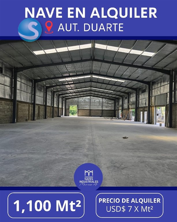 Nave en Alquiler AUT DUARTE, MERCA STO DGO »1,100Mts² Precio de Alquiler: USD$7 x mt² AMENIDADES: ** Fácil acceso. ** Doble altura ** Zona Industrial **Oficinas **Baños ** Atracaderos para 6 Furgones simultáneamente ** Parqueos ** Rampa ** Anden **Seguridad 24/7 **Verja Perímetral ** Luz y Agua 24/7 ** Todos los servicios Otras opciones similares en la zona diversos metrajes y Precios. Naves industriales MarinoA. 829-838-8000 Tenemos 13 años en el ámbito comercial e Industrial contamos con una gran variedad de naves y solares de diversos tamaños precios y ubicaciones.