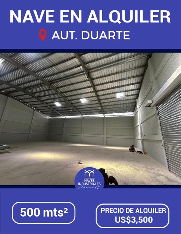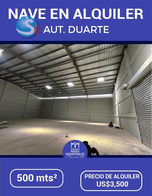 Nave en Alquiler Aut Duarte 500 Mts² Precio de Alquiler: 3,500 us AMENIDADES: Buen acceso Baños Area de carga y descarga Luz y Agua 24/7 Todos los servicios Más información 829-838-8000 Somos Naves Industriales Marino A.
