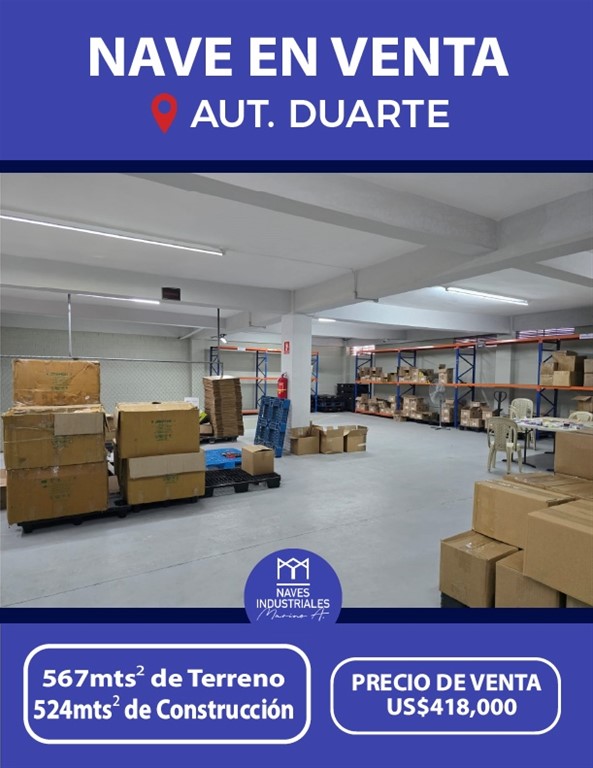 Edificio comercial Tipo nave en venta Ubicación Autopista Duarte. 567mts² de Terreno 524mts² de Construcción Dos niveles Precio de venta: USD$418,000 AMENIDADES: - 1er Nivel 287 mts2 Lobby Salón de conferencias Dos baños 150 metros de almacén Rampa para carga y descarga Parqueo para 10 vehículos Caseta para planta eléctrica Verja perimetral con portones eléctricos - 2do Nivel 237 mts2 Oficinas ejecutivas Oficinas de apoyo Sala de vendedores Kitchenette Dos baños Amplia terraza Almacén Aires acondicionados en todos los espacios Terminaciones de calidad Luz y Agua 24/7 Todos los servicios Otras opciones similares en la zona con diversos metrajes y precios. Naves Industriales MarinoA. 829-838-8000 Tenemos 13 años en el ámbito comercial e industrial. Contamos con una gran variedad de naves y solares de diferentes tamaños, precios y ubicaciones.