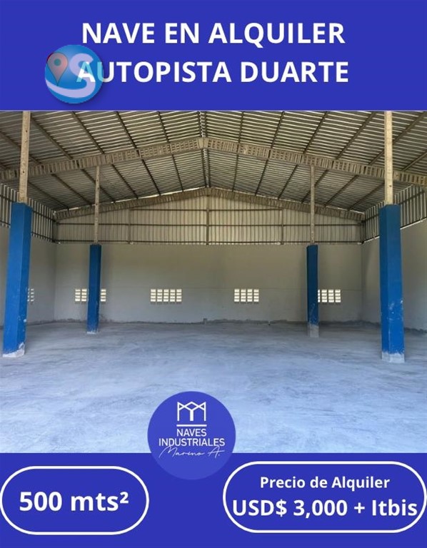 ?? Naves en Alquiler ???? ?? Ubicación Estratégica – Aut. Duarte Km 22 ?? 500 Mts² ?? Precio de Alquiler: USD$ 3,000 + Itbis ? AMENIDADES: ? Excelente acceso?? ? Imagen Comercial ?? ? Doble altura ?? Baño ? Parqueos ??? ? Verja Perímetral ? Luz y Agua 24/7 ???? ? Todos los servicios ?? ?? Otras opciones similares en la zona con diversos metrajes y precios. ?? Naves Industriales MarinoA. ?? 829-838-8000 ?? Líderes en Alquiler y Venta de Naves y Solares Industriales en toda República Dominicana.