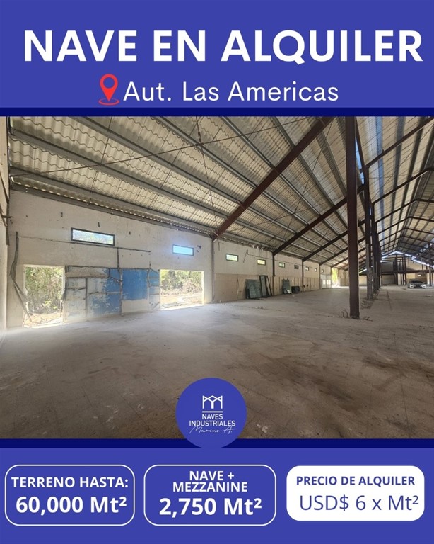?? ¡La Nave que necesitas está aquí, en la mejor ubicación! ?? ?? Autopista Las Américas – A solo 15 minutos del Puerto de Caucedo, con acceso directo a las principales vías del país. ?? 60,000mts² de Terreno Disponibles para Alquiler ?? Diseñamos tu nave desde cero, adaptada a tu negocio. ? Ideal para: • Centros de Distribución • Almacenamiento en seco o frío • Bomba de Combustible • Supermercados, Food Market y más ?? Primera Etapa: *Nave de 2,400mts²* (opcional menor o mayor metraje) Amenidades incluidas: ? Doble y triple altura ? Oficinas modernas ? 4 Atracaderos ? Mezanine ? Amplio Parqueo ? Baños ?Luz y Agua 24/7 ?Todos los servicios ? Precio especial de introducción: *USD6us x mt* Asesoría gratuita ?? Garantizamos tu inversión con más de 13 años de experiencia en el mercado. ?? Contáctanos hoy: 829-838-8000 Naves Industriales Marino A.