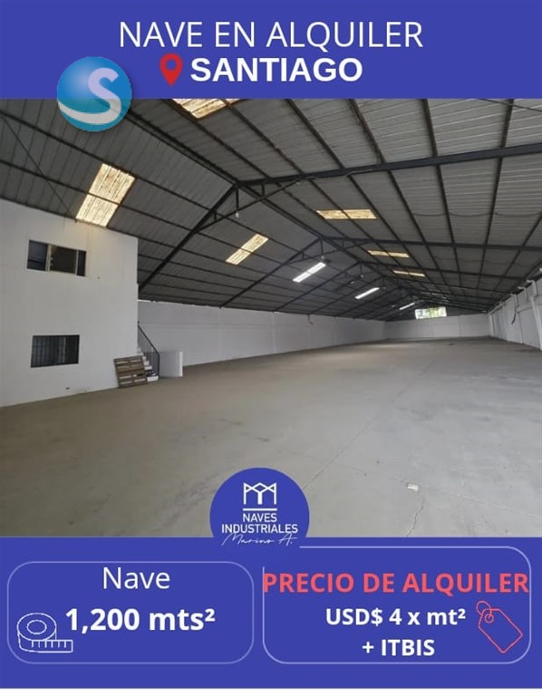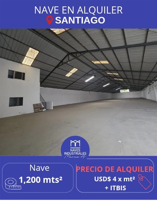 Nave en Alquiler ?? Ubicación: Santiago?? ?? 1,200 Mts² de construcción ? AMENIDADES: ? Vía Principal?? ?? Parque de Naves cerrado ? Doble altura ? Oficinas en 2 niveles ?? Baños ? Amplios Parqueos ??? ? Verja Perímetral ? Luz y Agua 24/7 ???? ? Todos los servicios ?? ?? Precio de Alquiler: 4us x mt² + Itbis ?? Otras opciones similares en la zona con diversos metrajes y precios. ?? Naves Industriales MarinoA. ?? 829-838-8000 ?? Líderes en Alquiler y Venta de Naves y Solares Industriales en toda República Dominicana.