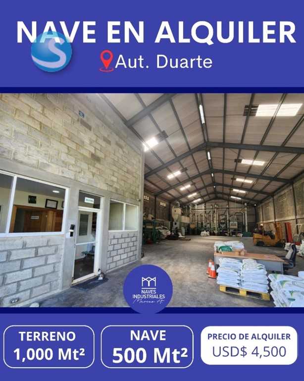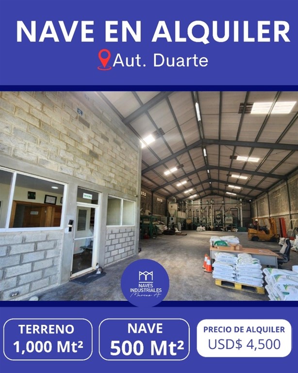Nave en Alquiler Aut Duarte, Sto Dgo. »500Mts² de construcción »1,000Mts² de Terreno Precio de Alquiler: USD$4,500 AMENIDADES: Vía Principal Doble altura Oficinas Baños Parqueos Verja Perímetral Luz y Agua 24/7 Todos los servicios Otras opciones similares en la zona diversos metrajes y Precios. Naves industriales MarinoA. 829-838-8000 Tenemos 13 años en el ámbito comercial e Industrial contamos con una gran variedad de naves y solares de diversos tamaños precios y ubicaciones.
