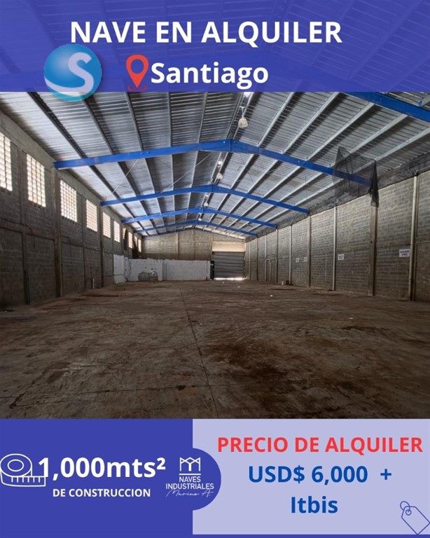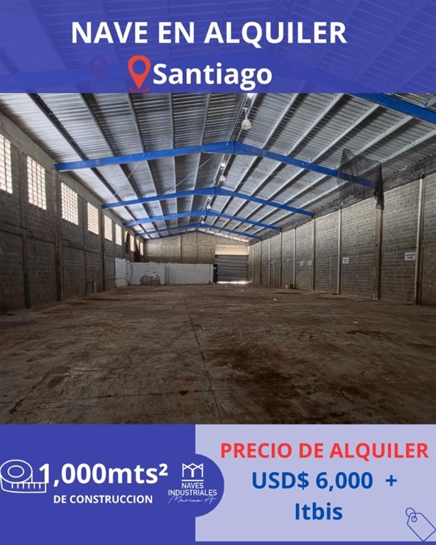 ?? Nave en Alquiler ???? ?? Ubicación Estratégica – Santiago ?? 1,000 Mts² ?? Precio de Alquiler: USD$6 x mt² + Itbis ? AMENIDADES: ? Via Principal ?? ? Parque de Naves con seguridad ?? ? Verja Perimetral ?? ?? Doble Altura ?? Oficinas ?? Kitchenette ?? Salón de conferencias ? Baños ?? ? Parqueos ??? ?? Área de Carga y Descarga ?? Portón eléctrico ? Luz y Agua 24/7 ???? ? Todos los servicios ?? ?? Otras opciones similares en la zona con diversos metrajes y precios. ?? Naves Industriales MarinoA. ?? 829-838-8000 ?? Líderes en Alquiler y Venta de Naves y Solares Industriales en toda República Dominicana.