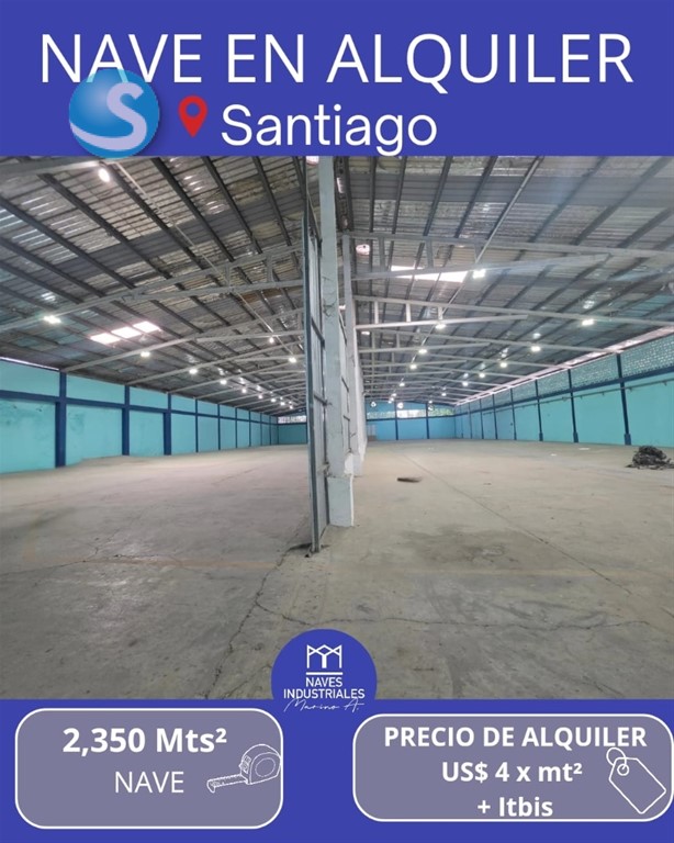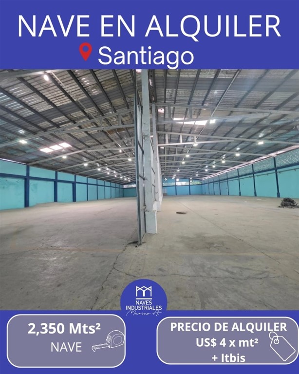 Nave en Alquiler ?? Ubicación: Santiago?? ?? 2,350 Mts² de construcción 3,000 mts² de Parqueos comunes ? AMENIDADES: ? Vía Principal?? ?? Parque de Naves cerrado ? Doble altura ? Oficinas en 2 niveles ?? Baños en cada oficina ?? 3 Baños para empleados ?? ?? Atracadero bajo Techo. ? Amplio Parqueo ??? ? Verja Perímetral ? Luz y Agua 24/7 ???? ? Todos los servicios ?? ?? Precio de Alquiler: 4us x mt² + Itbis ?? Otras opciones similares en la zona con diversos metrajes y precios. ?? Naves Industriales MarinoA. ?? 829-838-8000 ?? Líderes en Alquiler y Venta de Naves y Solares Industriales en toda República Dominicana.