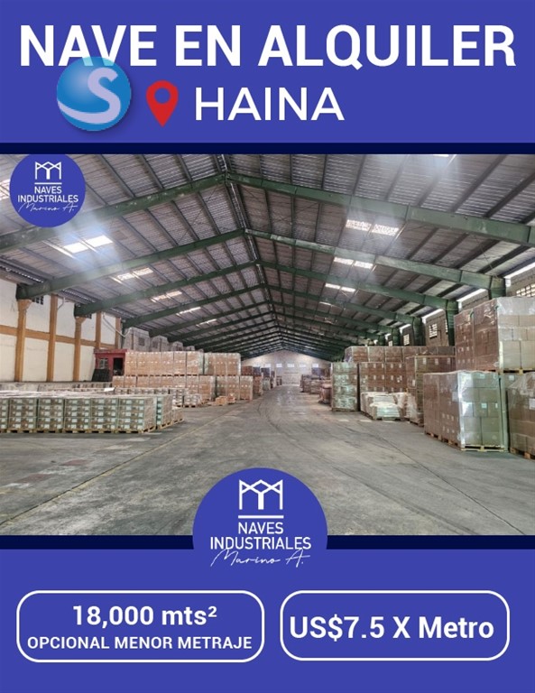 Nave Industrial en Haina 18,000 mts² Opcional menor metraje 7.5 us por metro AMENIDADES: Hasta 12 mts de altura Oficinas Baños Atracaderos Entrada a nivel de piso Luz 24/7 Luz trifásica y 220 Abundancia de agua (pozo y cisterna) Excelente acceso ?Entorno industrial Todos los servicios ?? Naves Industriales MarinoA ?? 829-838-8000 Con más de 13 años de experiencia en el sector comercial e industrial, ofrecemos la mejor variedad de naves y solares en las mejores ubicaciones.