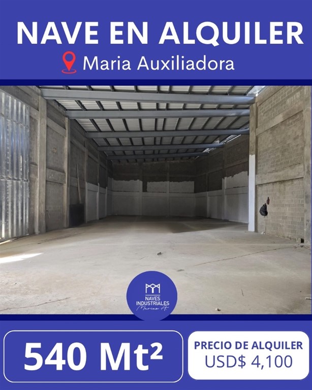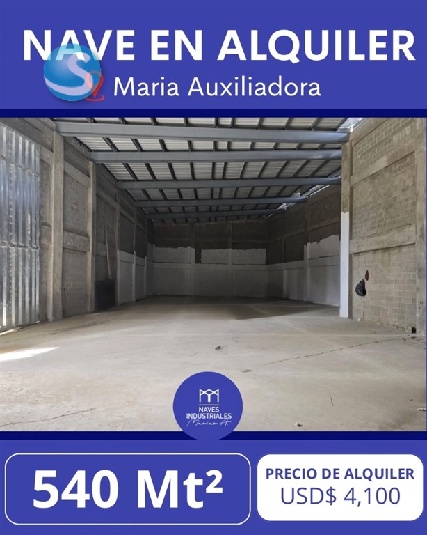 NAVE INDUSTRIAL EN ALQUILER Ideal para Taller -Punto Comercial - Almacén Maria Auxiliadora US$4,100 Mensuales Características: 540 m² de construcción Excelente acceso Oficina Triple altura Baño Luz 24/7 Todos los servicios Ubicación estratégica con fácil acceso a vías principales. 829-838-8000 Naves Industriales MarinoA. 13 años de experiencia en el ámbito comercial e industrial. Ofrecemos gran variedad de naves y solares de distintos tamaños, precios y ubicaciones.
