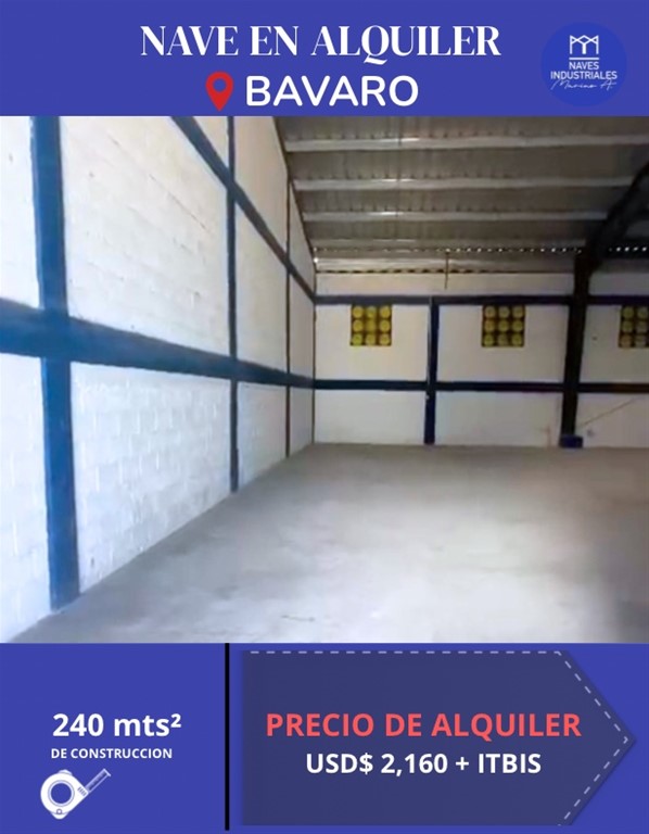 Nave en Alquiler Av. Barcelo Verón, Bávaro 240mts² de construcción AMENIDADES: Vía Principal Parque de Naves con seguridad Doble Altura Oficinas Baños Mezanine en Concreto Fácil acceso para maniobra de Carga y descarga Luz y Agua 24/7 Todos los servicios Mantenimiento 1US x mt² Precio de Alquiler: USD$2,160 + Itbis Otras opciones similares en la zona con diversos metrajes y precios. Naves Industriales MarinoA. 829-838-8000 Líderes en Alquiler y Venta de Naves y Solares Industriales en toda República Dominicana. Contamos con una gran variedad de naves y solares de diferentes tamaños, precios y ubicaciones.
