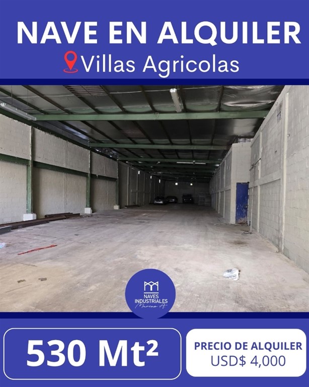 Nave en Alquiler ?? ??Villas Agrícolas »530Mts² ??Precio de Alquiler: USD$4,000 AMENIDADES: ?Vía Principal ?Doble altura ?Oficina ?Baño ?Luz y Agua 24/7 ?Todos los servicios ??Otras opciones similares en la zona diversos metrajes y Precios. Naves industriales MarinoA. ??829-838-8000 ??Tenemos 13 años en el ámbito comercial e Industrial contamos con una gran variedad de naves y solares de diversos tamaños precios y ubicaciones.