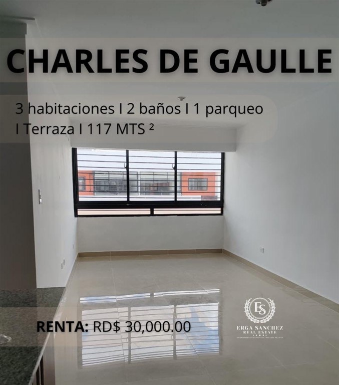 AMPLIO PENTHOUSE en RENTA A ESTRENAR en la CHARLES DE GAULLE CARACTERISTICAS: 4to piso 3 amplias habitaciones Habitación principal con su baño 2 baños 1 medio baño 117 mts 2 Área de lavado Terraza 1 parqueo RENTA: RD$ 30,000.00