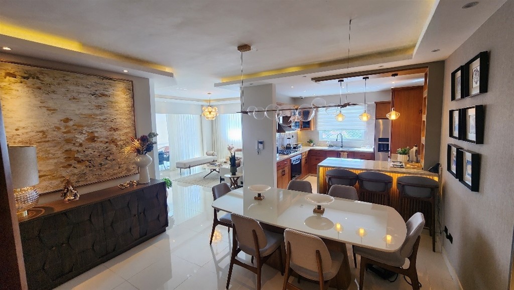 El millón Penthouse de 378mts Finamente amueblado y decorado Pisos 6 y 7 *Primer Nivel;* Recibidor Sala / comedor Medio baño de visita Cocina fría Cocina caliente Habitación de servicio con baño Balcón frontal con vista despejada 3 habitaciones con baño *2do piso* Habitación principal con baño y doble closet Estudio Bar Baño de visita Terraza privada con; Jacuzzi Area de BBQ Deck Vista despejada Apartamento cuenta con; Sistema de circuito cerrado Repetidores de Wifi 3 parqueos paralelos 2 Lockers Lobby Gas común Seguridad 24/7 Precio de venta amueblado; US$610,000 Mantenimiento; RD$12,500
