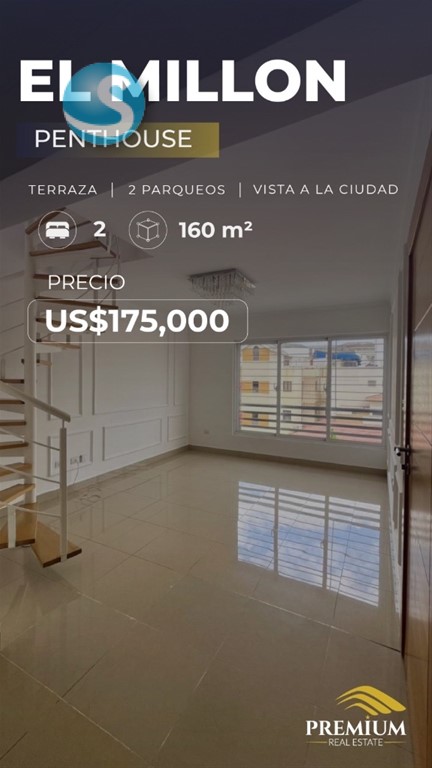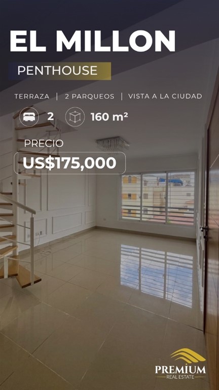 Penthouse en el millón LISTO PARA OCUPAR!! Descubre este penthouse en El Millón con hermosa terminación y amplia terraza para el disfrute de la familia y amigos. Con 160 m2 de construcción 4 y 5 sin ascensor. 2 habitaciones 2 baños completos 2 medios baños Sala Comedor Cocina moderna con desayunador Area de lavado Cuarto de servicio Terraza techada y destechada en el 2do. piso y 2 espacios de parqueos paralelos. Disfruta de vistas panorámicas de la ciudad desde su terraza privada. Precio de venta US$175,000