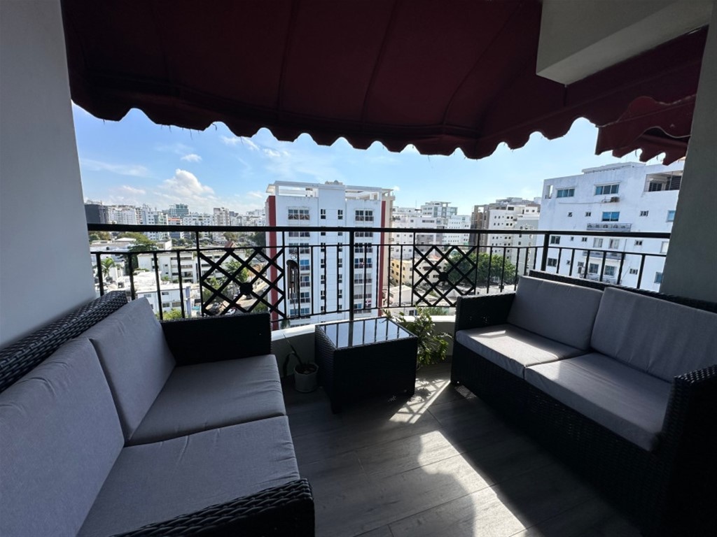 Penthouse con buena ubicacion, buena ventilacion y mucha claridad. Esta cerca de la 27 de febrero con facil acceso a supermercados, farmacias y plazas comerciales. Es excelente para quienes buscan espacio. Penthouse de 2 niveles con 348.28 m2 netos. 4 habitaciones cada una con bano y walk-in closet. 2 habitaciones en primer nivel y 2 en el segundo. Medio bano de visita. Recibidor. Uno apartamento por piso y control de acceso por piso. Area de estar. Family en el segundo nivel. Sala y comedor independientes. Cocina abierta moderna. Terraza privada en el segundo nivel muy acogedora, techada y destechada. 2 parqueos techados paralelos. Cuarto de servicio y area de lavado. Area de almacen. Precio incluye los aires acondicionados.