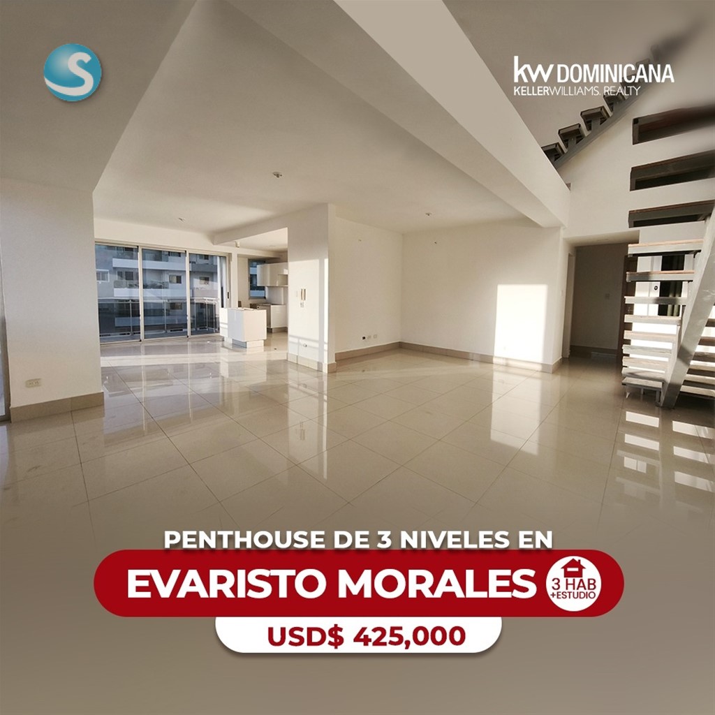 Penthouse de 3 niveles en Venta | Piso 10 Vive la experiencia de un hogar moderno, amplio y lleno de estilo, en este espectacular PH, diseñado para disfrutar el confort y la elegancia cada día. Ubicación estratégica: cerca de restaurantes, bancos, colegios y comercios. Características destacadas: • 3 habitaciones • 4.5 baños • Cocina caliente y fría • Amplio balcón y terraza con vistas espectaculares • Estudio con baño privado • Cuarto de servicio con baño • Preinstalación de A/C • 3 parqueos techados + 2 lockers • Pet Friendly • Se vende en condiciones actuales (terminación completada en 90%) Precio: US$425,000 Sugeiley Ozuna 809-885-0795 Kw Capital