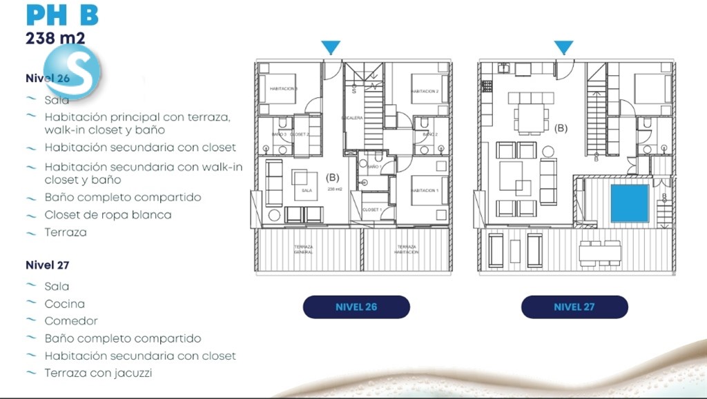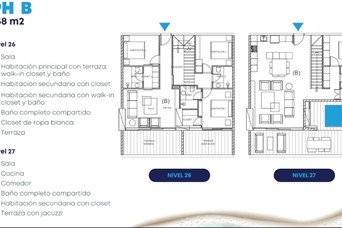Vendo en Juan Dolio con vistas al mar espectaculares, en primera linea de playa Penthouse en planos de dos niveles tres hab. y estudio,238 mt2 Areas sociales fantasticas, piscina, gim ,restaurant, area de yoga , sauna y masajes. Piso 26 Sala Habitación principal con terraza, walk-in closet y baño Habitación secundaria con closet Habitación secundaria con walk-in closet y baño Baño completo compartido Closet de ropa blanca Terraza Piso 27 Sala Cocina Comedor Baño completo compartido Habitación secundaria con closet Terraza con jacuzzi Lobby doble altura profesionalmente amueblado y decorado con área de Valet Parking. The Terrace: Gran terraza principal con bares,zona familiar, zona de adultos, zona de niños y solarium. The Oasis: Piscinas con jacuzzis y vista al mar en los niveles 1 y 6. (Carril de nado en el nivel 1) The Playground: Área de juegos para niños climatizada en el área de playa. The Splash Pool: Piscina para niños. Rouge: Bar tipo speakeasy. The Yellow Space: Espacio de coworking. The Wellness Room: Área de sauna y masajes. Social Kitchen: Espacio disponible para degustaciones. The Gym: Gimnasio profesionalmente equipado. The Cinema: Sala de cine. Teens Club: Área social para adolescentes equipado con consolas y juegos de última generación. The Blue Room: Espacio de bar y restaurante precio USD 761 600 Tony Galvez 829 549 1217 829 848 0525