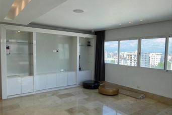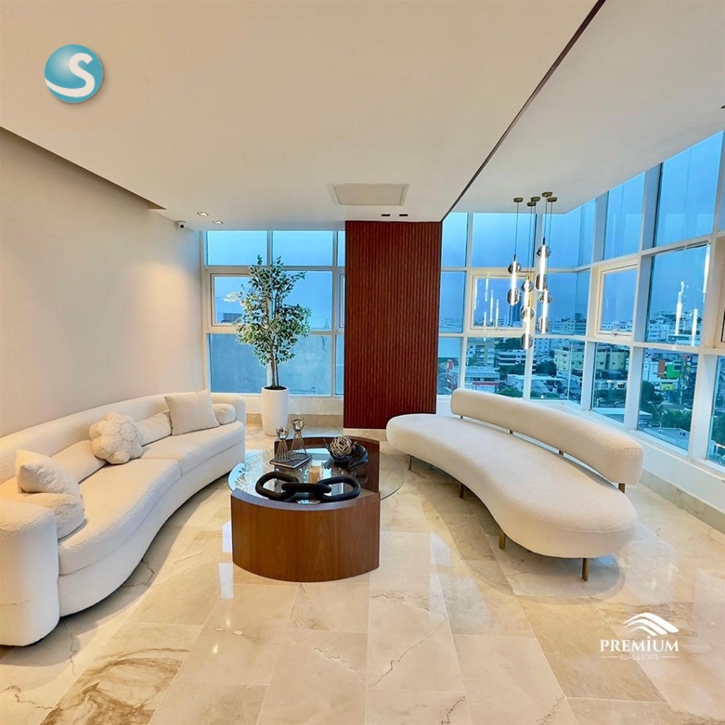 Los Cacicazgos Penthouse exclusivo de 460 metros 1er Nivel 2 habitaciones con sus baños y walking closets Estudio Impresionante sala con cristales de piso a techo Comedor súper amplio Cocina con Isla y comedor incluido, equipada con electrodomésticos Smeg (Estufa empotrada, Extractor, Horno y Lavaplatos). Cocina caliente Cuarto de servicio Baño para visitas 2do Nivel Habitación principal espaciosa con walking closet, baño y balcón. Family con bar incluido Amplia terraza El ascensor llega directo al segundo nivel. 3er nivel Amplia terraza destechada Habitación de huéspedes con su baño Espacio para gimnasio equipado con bocinas Espacio para sauna si así lo desean y un espacio abierto con instalaciones para jacuzzi. Sistema de bocinas Sonos en todo el Penthouse. Área de cámaras y controles. Sistema de aire central en primer y segundo nivel. Pisos en mármol 3 parqueos 2 amplios lockers Torre cuenta con: Ascensor Lobby Área de chóferes Seguridad Precio de venta: US$680,000 Mantenimiento: RD$20,000