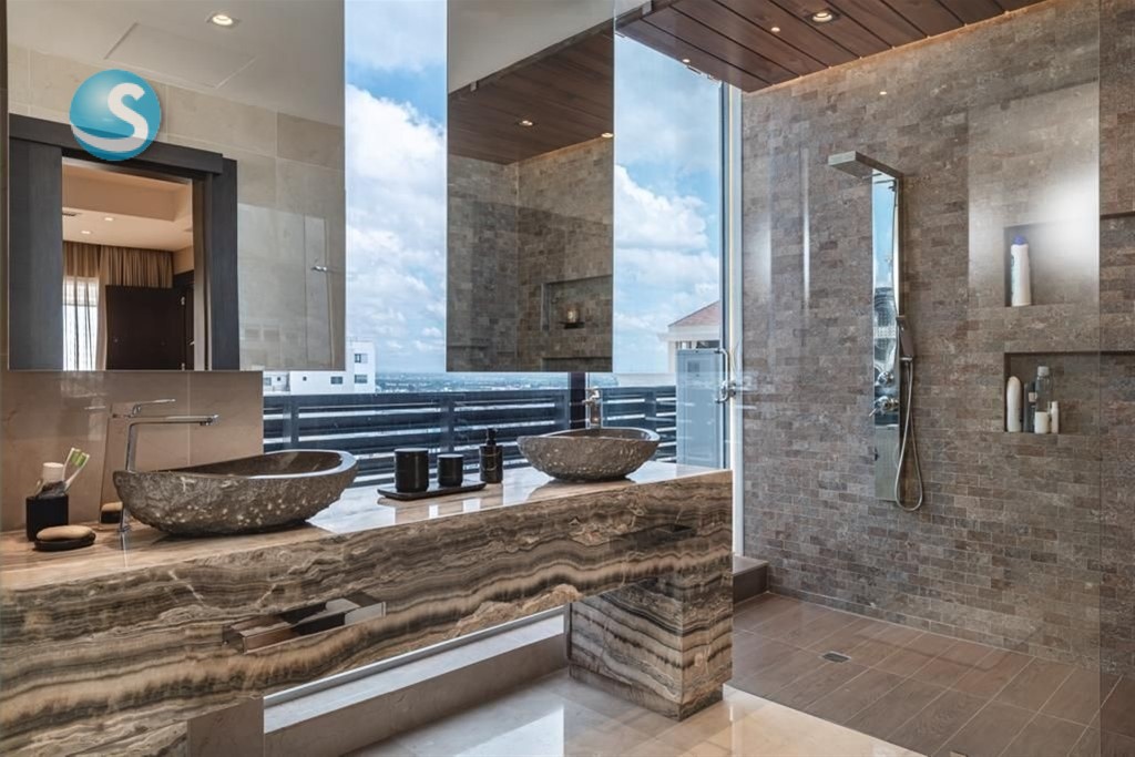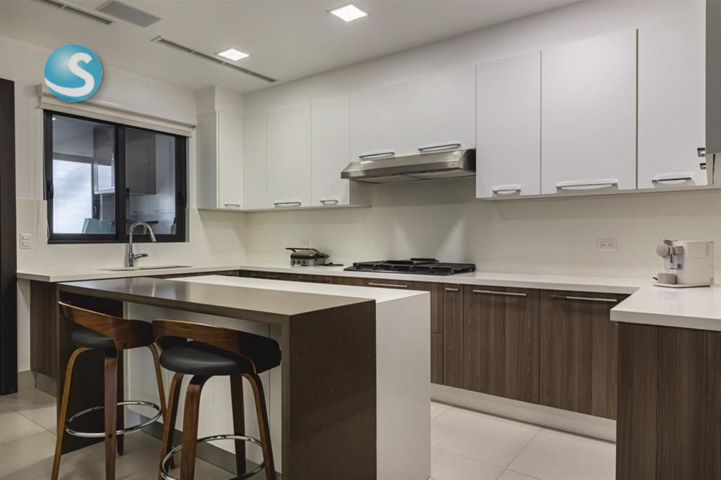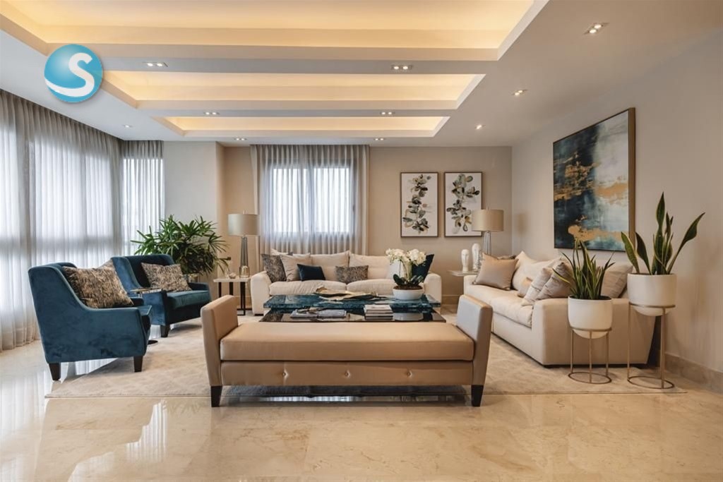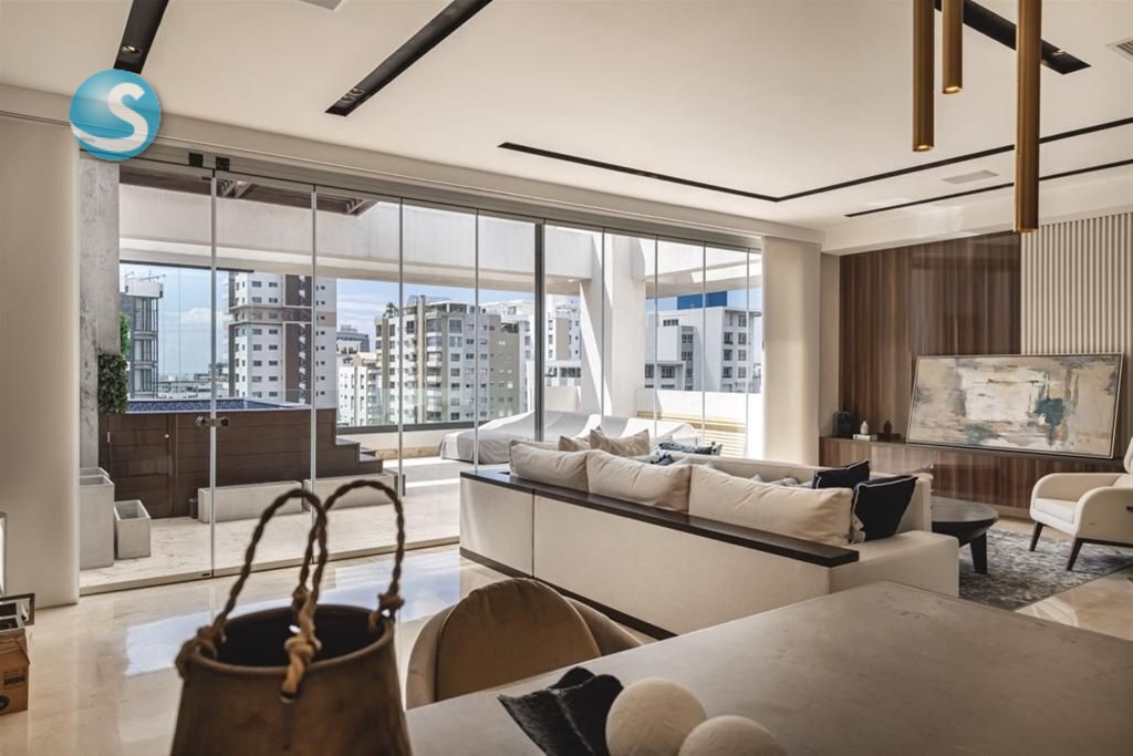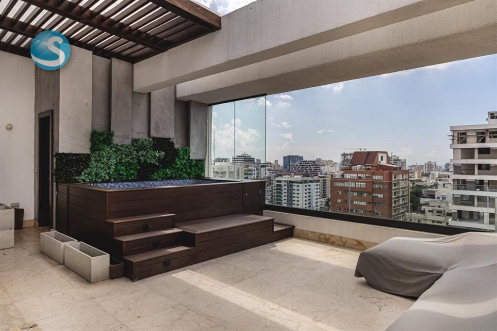 575mts netos. 650mts total. Tres (3) habitaciones 3.5 Baños Comedor Cocina fría y caliente Estudio Estar familiar Terraza privada (37mts) Área de lavado + Hab/Servicio Dos (2) ascensores de última generación Lobby Climatizado + Concierge 24H Video intercom Seguridad vigilante 24H. Tres (3) parqueos techados. Salón de choferes Planta eléctrica Estacionamientos para visita y servicios. Área común; Piscina Gimnasio Espacio de niños Lounge Terraza techada ----------------------------------------------------------- VENTA; US$1,550,000.00 LÍNEA BLANCA Y AIRES ACONDICIONADOS INCLUIDOS. -----------------------------------------------------------