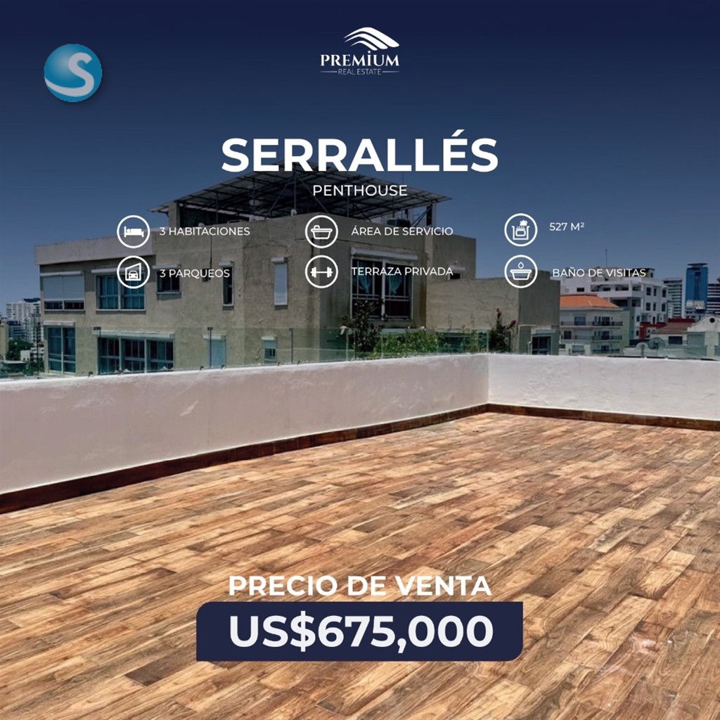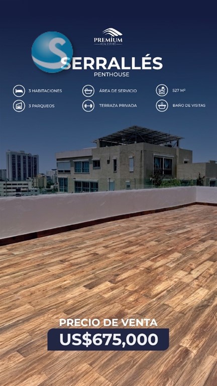 ?? Penthouse en Venta Serrallés?? Vive la elegancia en las alturas. Este exclusivo penthouse de 527 m² forma parte de una torre boutique de solo 11 unidades, diseñada para ofrecer privacidad, amplitud y confort en una ubicación privilegiada. ? *Distribución: • Salas y comedor con doble altura • Cocina funcional y área de servicio independiente • Estudio privado y baño de visitas • 3 habitaciones, cada una con baño y walk-in closet • Terraza privada, perfecta para reuniones o relajarte • 3 parqueos asignados ?? *Amenidades: • Ascensor de última generación • Planta eléctrica full • Lobby climatizado • Baño de servicio para personal Precio: 675,000 USD