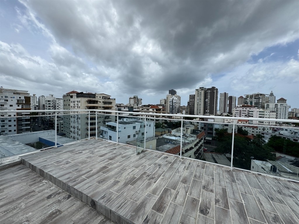 Contacto Juan Manuel Martinez 809 815-6666. Excelente Pent House amplio, iluminado y de espacios muy funcionales. Edificio de pocos apartamentos, de ubicación medial en calle muy tranquila. Edificio con Lobby, Elevador, Gas común y Planta de emergencia Full. Pisos en porcelanato. Madera preciosa. Calentador a gas. Descripción del penthouse 410mts2 netos de construcción 3 terrazas abiertas 4 habitaciones cada una con walking closet y baño. Baño de visita. Sala, comedor, estar. Cocina abierta. 2 Parqueos. 1 Locker. Picuzzi. Deck y BBQ en terraza ultimo nivel.