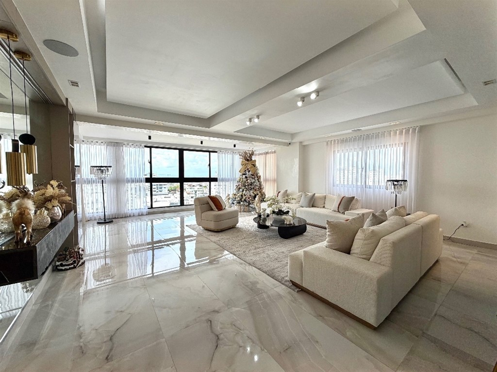 Lujoso Penthouse en Urb. Real Torre Familiar ubicada próximo a la Av. Enriquillo. Solo 2 Apartamentos por piso. 4 HAB | 4.5 BAÑOS | TERRAZA CON JACUZZI | 3 PARQUEOS + LOCKER - 401 metros - 4 habitaciones con baño y w/c - 2 medio baño - Amplia Sala - Comedor * Dos (2) cocinas (fría y caliente) * Área de lavado * Cuarto de servicio - Amplia Terraza con BBQ - Jacuzzi privado - 3 parqueos + locker - Ventanales de piso a techo que ofrecen una vista despejada y mucha iluminación natural Cuenta con: - Paneles Solares (no paga luz) - Shutters - Sistema de sonido Amenidades: * Jacuzzi * Dos Terrazas * Salón Multiuso * Gimnasio * Área de BBQ * Lobby Amueblado * Ascensor * Planta Eléctrica Full Año de construcción 2024