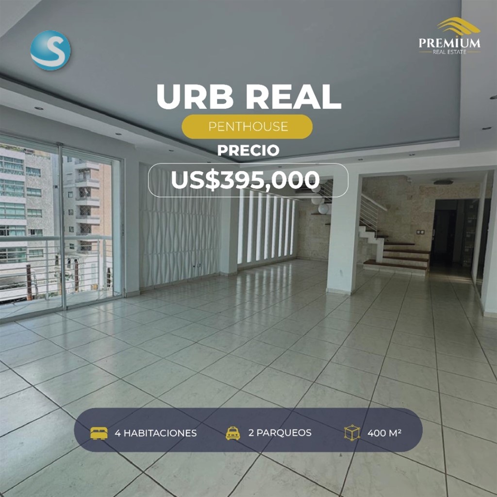 Urb Real (Pent House) Torre Familiar Nivel 5 y 6 400mts 4 Habitaciones 4.5 Baños Sala Comedor Balcón Cocina 2 Terrazas Family Room 2 Parqueos Techados Ascensor Planta full Gas común Lobby Precio: US$395,000 Mantenimiento: RD$10,000
