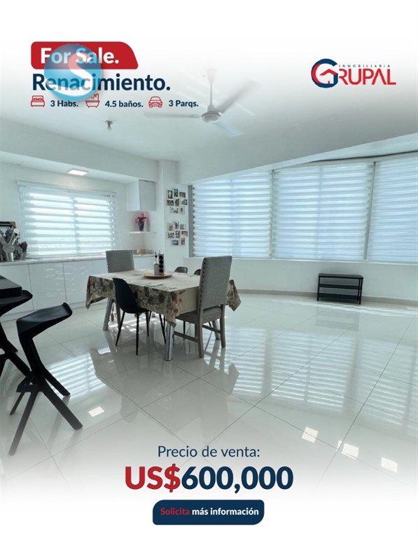 Moderno Penthouse ubicado en Renacimiento CARACTERÍSTICAS DEL APARTAMENTO Piso alto 3 habitaciones con walking closet 4.5 baños 2 terrazas Sala Comedor Desayunador Cocina Área de lavado CARACTERÍSTICAS DE LA TORRE Ascensor Cámaras de seguridad Gimnasio Piscina Lobby Precio de venta US$600,000 Información: 849-506-5220 Gianela Santana