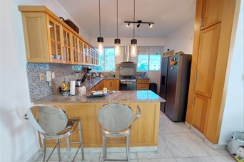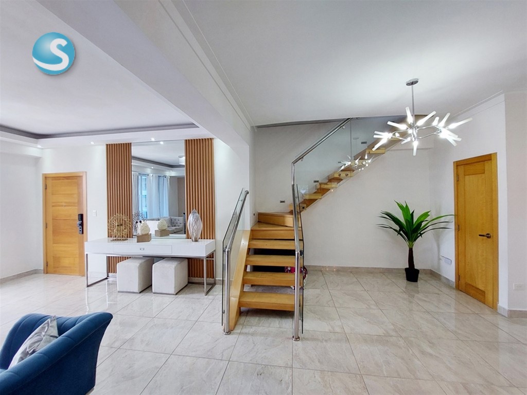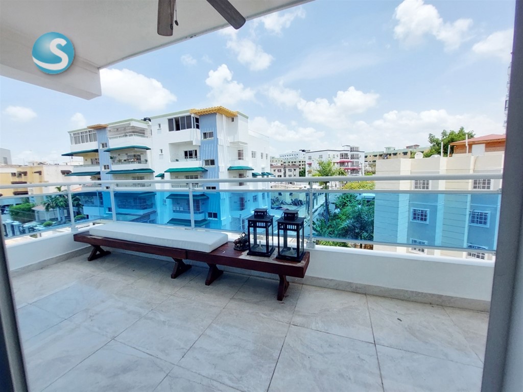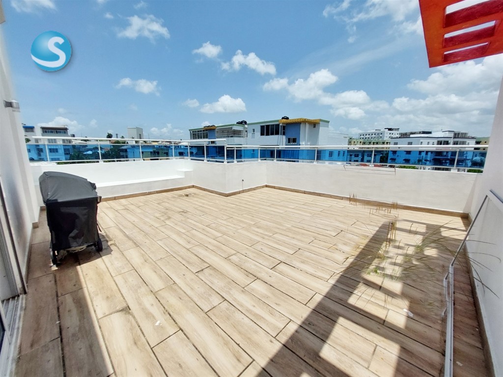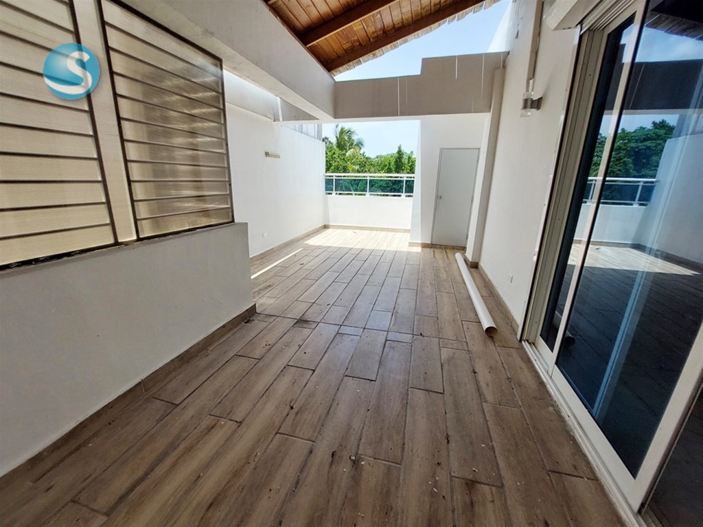 De Oportunidad!! Este penthouse es ideal para familias grandes. Con 256m2 en pisos 4 y 5, cuenta con 4 habitaciones, 3 baños completos, 2 medios baños, balcón, dos terrazas, una techada, elegante escalera, estar familiar, cocina moderna con desayunador, 3 parqueos techados. Edificio sin ascensor, con portón eléctrico, intercom. El penthouse cuenta con hermosos trabajos en yeso en el techo de la sala y estar familiar, con luces empotradas. Distribución: 1er. nivel: sala, comedor, balcón, medio baño, cocina con desayunador, área de lavado y cuarto de servicio, tres habitaciones, la principal con walk-in closet forrado y baño, y dos habitaciones secundarias con closet de pared y baño común. 2do. nivel: medio baño, estar familiar, 4ta. habitación con su baño completo, terraza techada y terraza destechada. Tiene shutters en las dos terrazas, balcón y ventana próxima a la escalera de emergencia, calentador a gas. Se alquila también vacío con aire acondicionado en la habitación principal y en el estar familiar del segundo nivel. Se vende en US$178,000 o se alquila en RD$59,000 con algunos aires acondicionados incluidos. Contáctame!