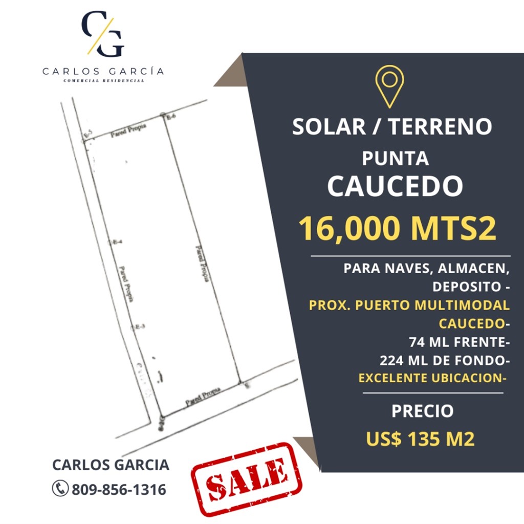 Solar / Terreno en Venta en Puerto Caucedo, Boca Chica – Ideal para Naves y Almacenes Se vende terreno en Puerto Caucedo, Boca Chica, una de las zonas de mayor crecimiento y desarrollo logístico de Santo Domingo Este. Ubicado próximo al Puerto Marítimo Punta Caucedo y a la Zona Franca Multimodal Caucedo, este solar es perfecto para proyectos industriales, logísticos y comerciales. Características del Terreno en Venta: • Superficie: 16,000 m² (16 mil metros cuadrados). • Dimensiones: 74 metros lineales de frente x 230 metros de fondo. • Estado: Terreno totalmente cerrado y listo para desarrollo. Usos ideales: • Construcción de naves industriales. • Nave para almacenamiento o almacén logístico. • Parqueos y patios de carga. • Almacén al aire libre o para almacenamiento de mercancías. • Complejo de naves para zona franca o logística. Ubicación estratégica: • A minutos de DP World Caucedo. • Próximo al Complejo Energético AES Andrés. • Cercano al puerto marítimo en Punta Caucedo y a la terminal marítima. • Zona de gran potencial para la inversión inmobiliaria en Boca Chica y proyectos de logística internacional. Precio de venta: USD $135 por m² Este solar en venta en Boca Chica, Puerto Caucedo representa una excelente oportunidad para inversionistas que buscan terrenos para naves industriales, almacenes y proyectos logísticos en una de las zonas más estratégicas de República Dominicana. Contáctanos hoy mismo para más información sobre este terreno en venta en Santo Domingo Este – Puerto Caucedo.