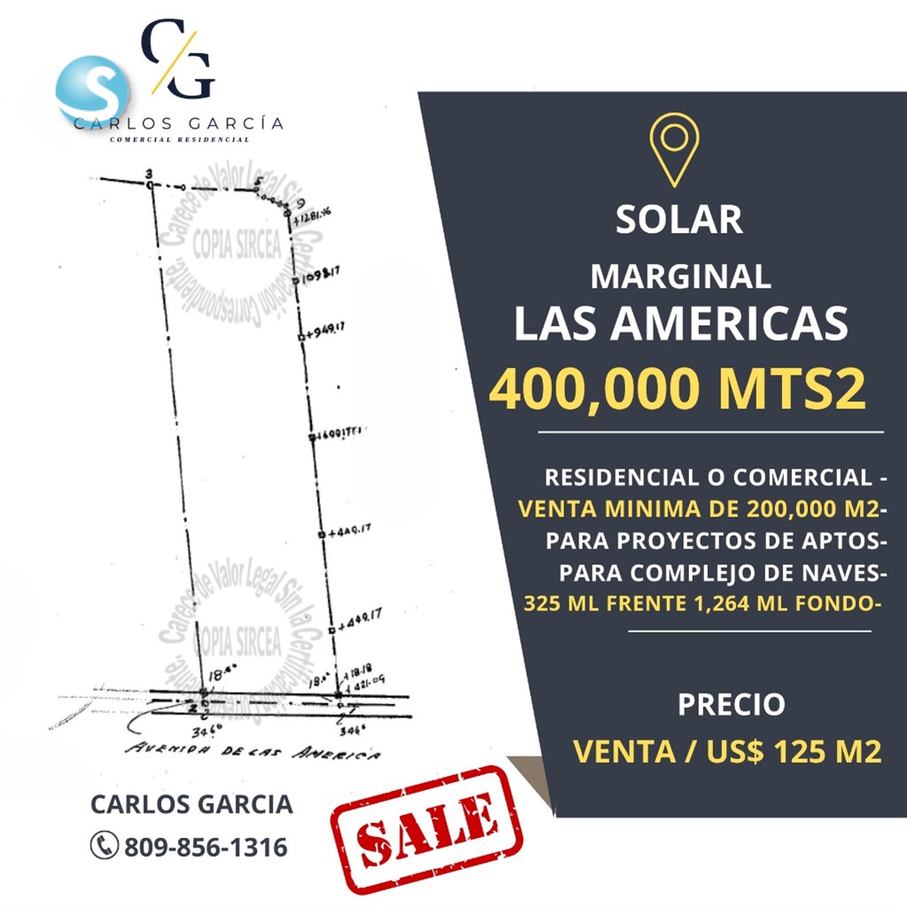 Solares y Terrenos en Venta en la Autopista Marginal Las Américas, Santo Domingo Este ¿Buscas solares o terrenos en venta en Santo Domingo Este? Tenemos terrenos desde 15,000 hasta 400,000 metros cuadrados ubicados estratégicamente en la Autopista Marginal Las Américas, una de las zonas con mayor crecimiento comercial e industrial del país. -Ideales para proyectos inmobiliarios residenciales, como complejos de apartamentos o urbanizaciones. -Perfectos para inversiones comerciales e industriales, incluyendo plazas comerciales, supermercados, tiendas por departamentos, naves industriales, centros logísticos y centros de acopio. Excelente ubicación con fácil acceso a la Autovía del Nordeste, el Aeropuerto Internacional Las Américas (AILA) y la zona franca. Contáctanos hoy y recibe asesoría personalizada para invertir en un terreno rentable en Santo Domingo Este. Aprovecha esta gran oportunidad inmobiliaria en la Marginal Las Américas. Más opciones https://www.feroca.net/properties/republica-dominicana/santo-domingo/santo-domingo-este/lot-type?commit=Aplicar¤cy_id=28&max_bathroom=&max_bedroom=&max_lot_size_square_meters=500000&max_price=&max_total_square_meters=&min_bathroom=&min_bedroom=&min_lot_size_square_meters=&min_price=&min_total_square_meters=&page=1&sort_by=published_at-desc&web_page=properties