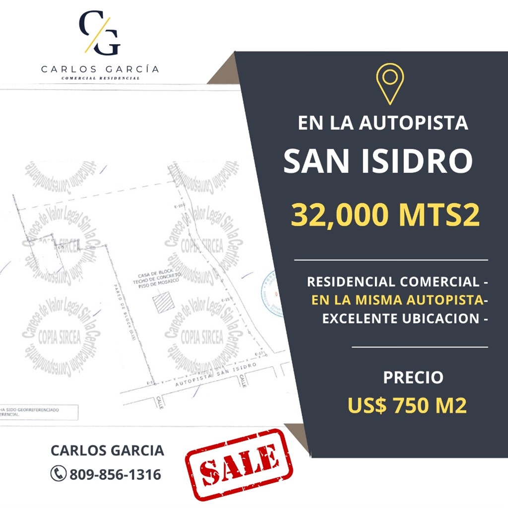 Terreno en Venta en la Autopista de San Isidro – Santo Domingo Este ¡Realiza tu inversión en una de las zonas de mayor crecimiento inmobiliario de Santo Domingo Este! Se vende solar de 32,000 m² estratégicamente ubicado en la misma Autopista de San Isidro, ideal para proyectos residenciales, comerciales o mixtos. Características principales: • Ubicación premium: frente a la Autopista de San Isidro, con alto flujo vehicular y excelente visibilidad. • Vocación residencial y comercial: perfecto para plazas comerciales, torres, residenciales cerrados o proyectos mixtos. • Terreno llano y listo para desarrollar. • Precio competitivo: US$750 por m² (negociable). Invertir en la Autopista de San Isidro es asegurar tu capital en una de las áreas con mayor plusvalía y desarrollo urbano del país. Contáctanos hoy mismo.
