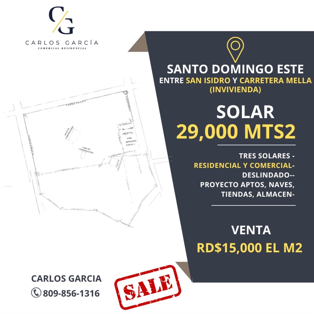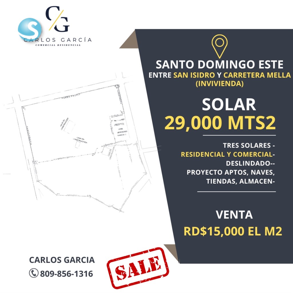 Terreno / Solar en Venta en Invivienda – Cerca de la Autopista San Isidro, Santo Domingo Este. Se vende terreno de 29,000 m², ideal para inversionistas que buscan un solar en venta en Santo Domingo Este con excelente ubicación y alta proyección comercial. Este amplio terreno para desarrollo es perfecto para proyectos como: • Proyecto de apartamentos y urbanizaciones • Almacenes y naves industriales • Centros logísticos • Tiendas, plazas comerciales y supermercados • Hospitales, clínicas y centros médicos Ubicación estratégica en Invivienda, a pocos minutos de la Autopista San Isidro, una de las zonas con crecimiento inmobiliario y demanda de terrenos comerciales e industriales. Ideal para inversionistas, desarrolladores y empresas que buscan un terreno amplio, versátil y de alto potencial.