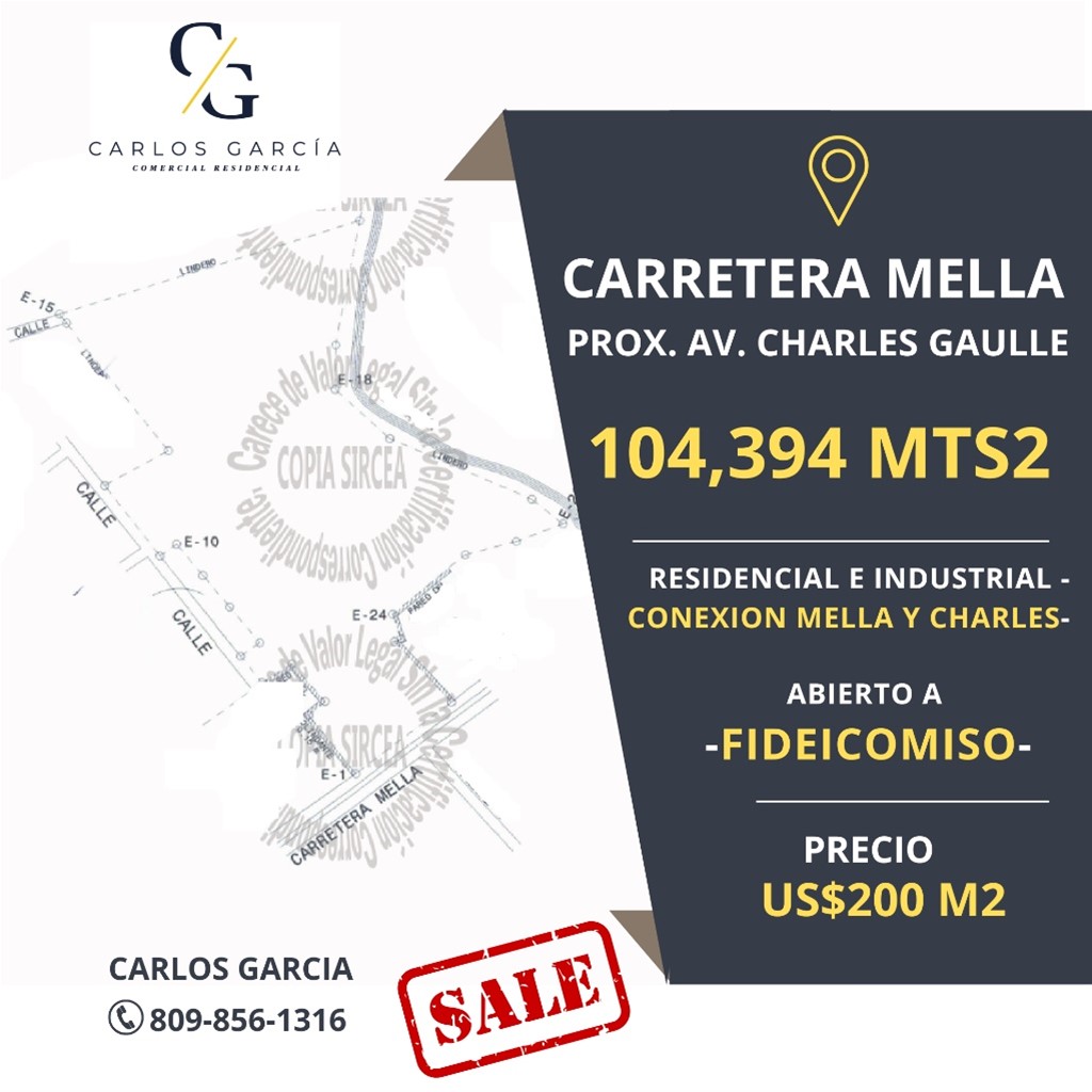 Solar- terreno en Venta Carretera Mella y Avenida Charles de Gaulle – 111,265 m² | Ideal para Proyectos de Apartamentos o Naves Industriales. Precio: US$175 por m² | Abierto a Fideicomiso. Descubra una oportunidad única de inversión inmobiliaria con este terreno de 111,265 metros cuadrados, estratégicamente ubicado a pocos metros de la intersección entre la Avenida Charles de Gaulle y la Carretera Mella, una de las zonas con mayor proyección de desarrollo urbano y logístico del Gran Santo Domingo. Ventajas competitivas del terreno: -Ubicación privilegiada: Su cercanía a importantes vías de acceso garantiza alto flujo vehicular y conectividad con zonas comerciales, residenciales e industriales. Esto lo convierte en un punto estratégico tanto para desarrolladores residenciales como para empresas del sector logístico e industrial. -Versatilidad de uso: Su vocación mixta permite desarrollar proyectos de apartamentos, urbanizaciones cerradas o complejos multifamiliares; así como también naves industriales, centros de distribución o parques logísticos para almacenamiento y operaciones empresariales. -Alto potencial para inversionistas: Este terreno representa una excelente opción para inversionistas inmobiliarios que buscan capitalizar en una zona en crecimiento, con alta demanda tanto de vivienda como de espacios industriales. -Facilidades para estructuración fiduciaria: Se encuentra abierto a fideicomiso, lo que facilita su desarrollo bajo esquemas financieros modernos, seguros y transparentes, ideales para captar fondos de inversión y garantizar una gestión eficiente del proyecto. -Atractivo precio por metro cuadrado: A solo US$175/m², ofrece una excelente relación valor-ubicación en comparación con terrenos similares en zonas de igual proyección y conectividad. Este solar es ideal para desarrolladores, constructores y grupos de inversión que desean ejecutar proyectos de alto impacto y rentabilidad. Ya sea para construir modernos complejos de apartamentos o centros logísticos industriales, este terreno ofrece la base perfecta para materializar una visión estratégica de largo plazo. MAS OPCIONES DE SOLARES Y TERRENOS: https://www.feroca.net/properties/republica-dominicana/santo-domingo/santo-domingo-este/lot-type?sort_by=published_at-desc