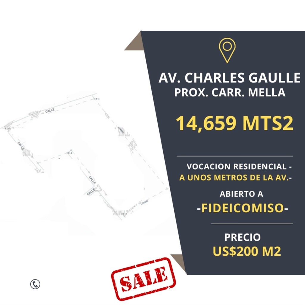 Solar-Terreno en Venta en la Avenida Charles de Gaulle, Próximo a la Carretera Mella. Ponemos a tu disposición un solar de 14,659 metros cuadrados, ubicado a escasos metros de la avenida Charles de Gaulle, en una de las zonas con mayor crecimiento y proyección del Gran Santo Domingo, próximo a la Carretera Mella. Este terreno en venta representa una excelente oportunidad para desarrollar un proyecto residencial de alta demanda, gracias a su ubicación privilegiada en un entorno urbano en constante expansión, ideal para familias que buscan cercanía a vías principales, centros educativos, comercios y transporte público. Beneficios y ventajas clave: • Ubicación estratégica: A pocos metros de dos arterias vitales de la ciudad: la Av. Charles de Gaulle y la Carretera Mella, facilitando la conectividad con Santo Domingo Este, Norte y el centro de la ciudad. • Vocación residencial: Perfecto para desarrollar un conjunto habitacional, apartamentos o urbanización cerrada, con potencial para captar la creciente demanda de vivienda. • Plusvalía garantizada: Zona en desarrollo constante, con alta valorización en el corto y mediano plazo, ideal para inversionistas y desarrolladores. • Facilidades legales y financieras: Abierto a FIDEICOMISO, lo que permite estructurar el proyecto con seguridad jurídica, confianza para compradores y acceso a financiamiento bancario. • Precio competitivo: Solo US$200 el metro cuadrado, una oportunidad atractiva considerando su metraje y ubicación. MAS OPCIONES DE SOLARES Y TERRENOS: https://www.feroca.net/properties/republica-dominicana/santo-domingo/santo-domingo-este/lot-type?sort_by=published_at-desc