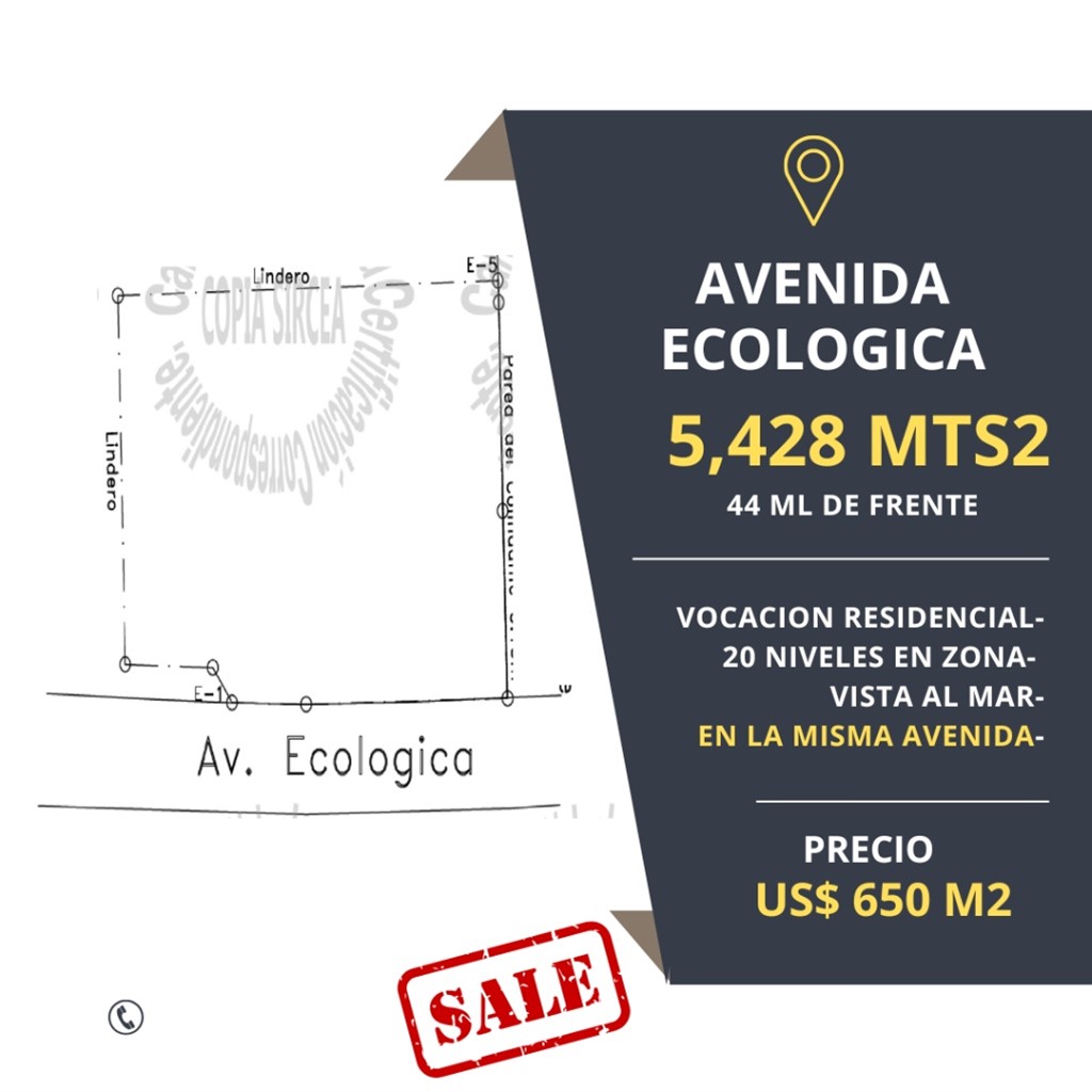 Solar en Venta en la Avenida Ecológica – Ideal para Proyecto de Torre Residencial de Alto Nivel ¡Oportunidad de inversión inmobiliaria en Santo Domingo Este! UBICACIÓN PREMIUM: Terreno de 5,428 m² estratégicamente ubicado en la Avenida Ecológica, una de las zonas con mayor desarrollo urbano y proyección de valorización en Santo Domingo Este. Acceso rápido a vías principales, centros comerciales y a solo minutos del Aeropuerto. VISTA INIGUALABLE AL MAR CARIBE: Este solar se encuentra sobre el farallón de la Ecológica, ofreciendo una vista panorámica espectacular al mar, lo que lo convierte en una opción ideal para un proyecto residencial de lujo. PERFECTO PARA DESARROLLO VERTICAL: Con vocación residencial de alta densidad, este terreno permite la construcción de hasta 20 niveles, ideal para el desarrollo de torres residenciales modernas, con apartamentos con vista al mar, rooftop, áreas sociales, entre otros. PRECIO POR M²: US$650 Una excelente oportunidad para desarrolladores inmobiliarios que buscan retorno de inversión en una zona en constante crecimiento. BENEFICIOS CLAVE: -Zona en expansión con alta demanda de vivienda vertical. -Frente a una de las principales avenidas de Santo Domingo Este. -Entorno natural privilegiado y vista al mar. -Ideal para inversionistas, arquitectos y promotores de proyectos de lujo. -Alta plusvalía. MAS OPCIONES DE SOLARES Y TERRENOS: https://www.feroca.net/properties/republica-dominicana/santo-domingo/santo-domingo-este/lot-type?sort_by=published_at-desc