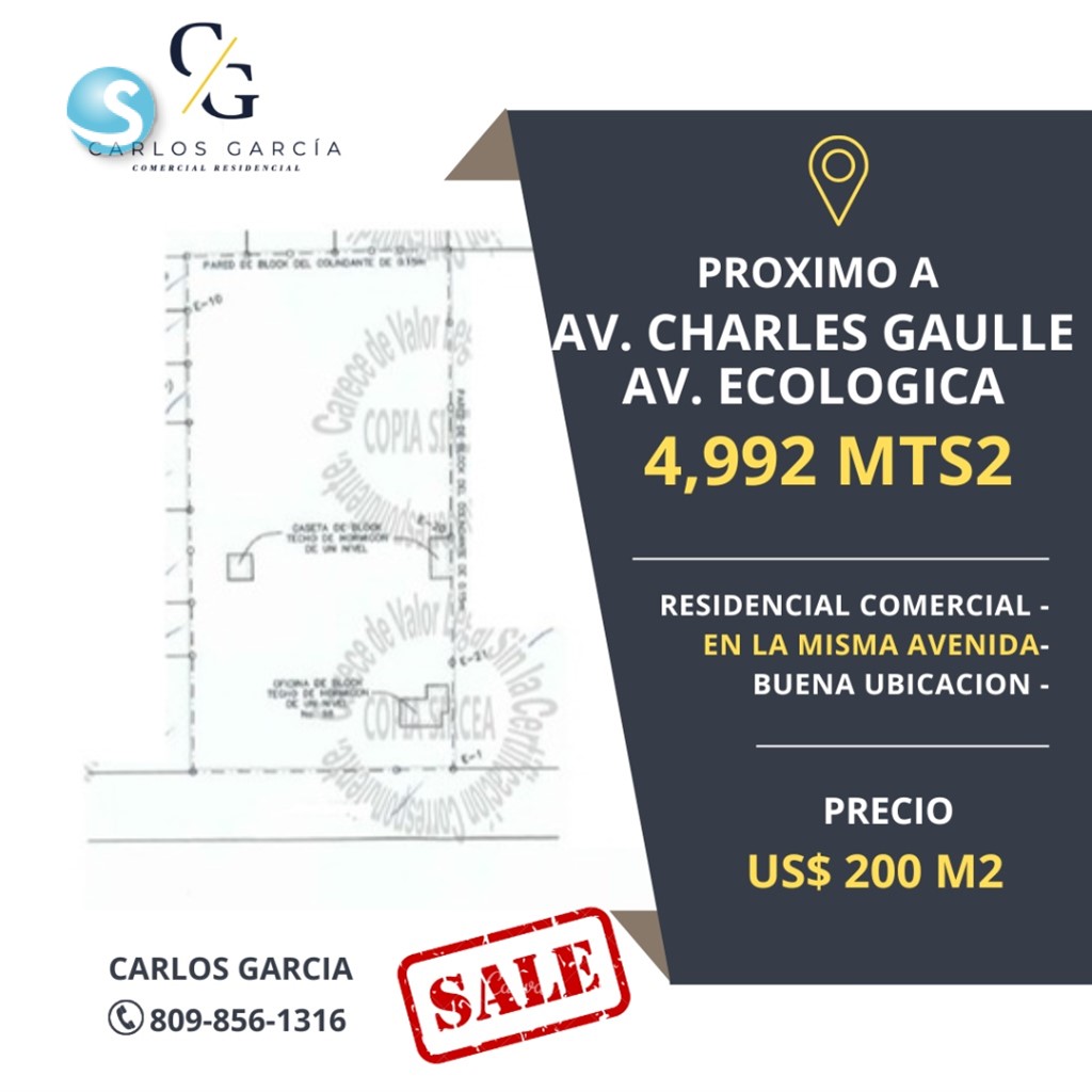 Terreno en Venta en Santo Domingo Este – Charles de Gaulle y Ecológica. Solar en Venta en Santo Domingo Este – Próximo a Av. Charles de Gaulle y Avenida Ecológica. -Ubicación Estratégica: Venta de terreno / solar en Santo Domingo Este, próximo la Avenida Charles de Gaulle y la Avenida Ecológica, dos de las vías más importantes y de mayor crecimiento en la zona. Características: • Superficie Total: 4,992 m² • Frente: 50 metros lineales • Fondo: 99 metros lineales • Precio: US$200 por m² Uso y Potencial: • Ideal para proyectos comerciales e industriales: tiendas, naves, almacenes, depósitos, centros de distribución. • Propicio para proyectos residenciales de alta demanda. • Ubicado en una avenida de alto tránsito vehicular y peatonal, lo que garantiza visibilidad y fácil acceso. Ventajas Competitivas: • Zona en constante desarrollo y valorización. • Cercanía a importantes arterias viales y áreas residenciales consolidadas. • Excelente oportunidad de inversión con alto potencial de retorno. Contáctanos hoy mismo y coordina tu cita para esta propiedad en una de las áreas con mayor proyección de Santo Domingo Este. Mas información: https://www.feroca.net/property/terreno-en-venta-en-santo-domingo-este-charles-de-gaulle-y-ecologica