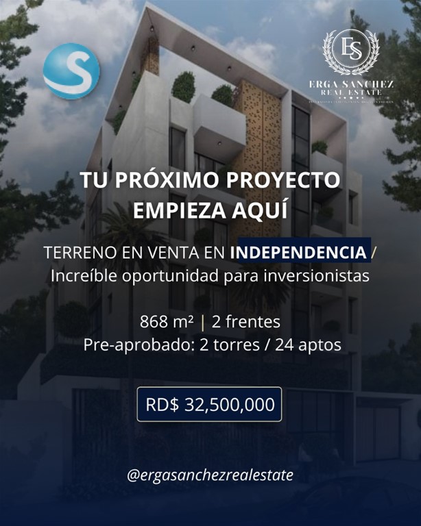 ?? TERRENO EN VENTA EN LA INDEPENDENCIA / Increíble oportunidad para inversionistas 868 m² | 2 frentes de 25 m c/u | Ideal para proyecto Excelente oportunidad para inversionistas y desarrolladores en una zona de alta proyección. ??CARACTERISTICAS Y AMENIDADES: 868 metros cuadrados 2 frentes, cada uno de 25 metros Pre-aprobación para construir: ? 2 torres ? 24 apartamentos en total PRECIO: RD$ 32,500,000 ?? Contáctanos para más información y coordinar visita. #JV
