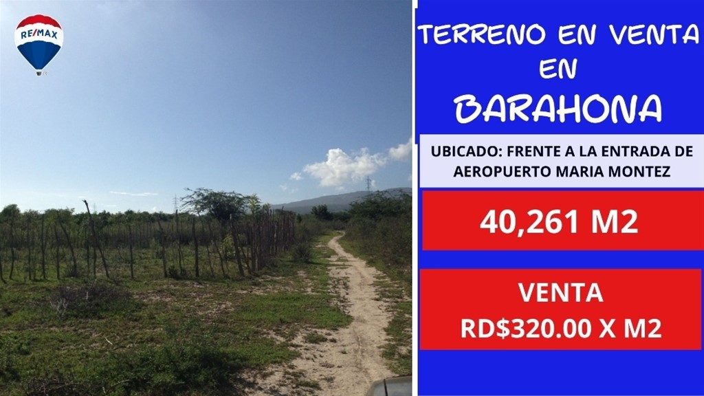 Terreno en venta en Barahona muy próximo al aeropuerto de Barahona. Tenemos 40,261 m2 en otro título tenemos 4900 m2y pueden ser mas metros disponible para la venta inmediata, titulo en mano, georeferenciado ambos. Este terreno por tener su ubicación tan próximo al Aeropuerto Internacional María Montez en Barahona, tiene una garantía de desarrollo y plusvalía bastante buena, excelente para construcción de naves o realizar proyecto habitacional. A RD$320 el m2 es mucho lo que puedes obtener de beneficio.