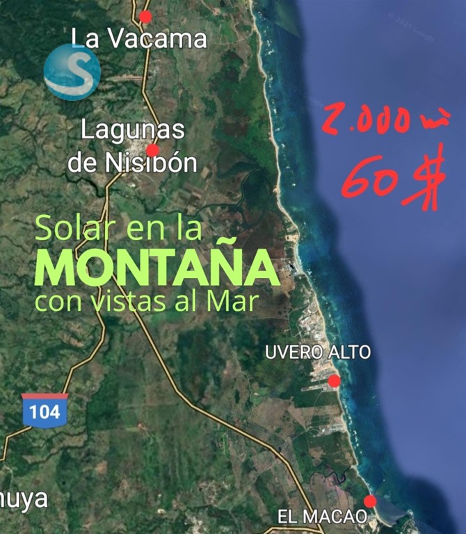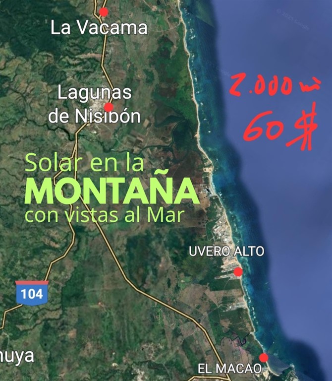 En la zona montañosa más cercana de BAVARO/PUNTA CANA , a solo 20 kms de distancia por la Autopista BOULEVARD TURISTICO DEL ESTE (10/15 minutos en coche) ...... En una preciosa "loma" con fácil acceso (buena carretera) , y desde donde se vé el MAR ....... se venden : 2.000 m² a 60 $/m² *** A solo 800 m de LAS LAGUNAS DE NISIBON , el pueblo mas cercano y grande de la zona. *** A solo 6 kms (en linea recta) de la Playa *** A 15 minutos de BAVARO