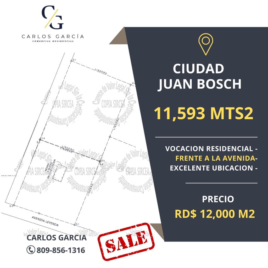 Terreno en Venta en Ciudad Juan Bosch, Santo Domingo Este Ubicación estratégica en Santo Domingo Este, dentro de la reconocida zona de Ciudad Juan Bosch, uno de los sectores de mayor crecimiento y desarrollo inmobiliario de la ciudad. Características del solar • Superficie: 11,593 m² • Frente: 69 metros lineales • Fondo: 168 metros lineales • Ideal para proyectos residenciales o urbanísticos • Con vocación residencial en un área rodeada de desarrollo de proyectos de apartamentos. Ventajas competitivas Este terreno en venta en Santo Domingo Este es perfecto para desarrolladores, inversionistas y constructoras que buscan una oportunidad única de inversión en bienes raíces. La zona cuenta con una creciente demanda de apartamentos, solares y proyectos habitacionales, lo que garantiza alta rentabilidad a corto y mediano plazo.