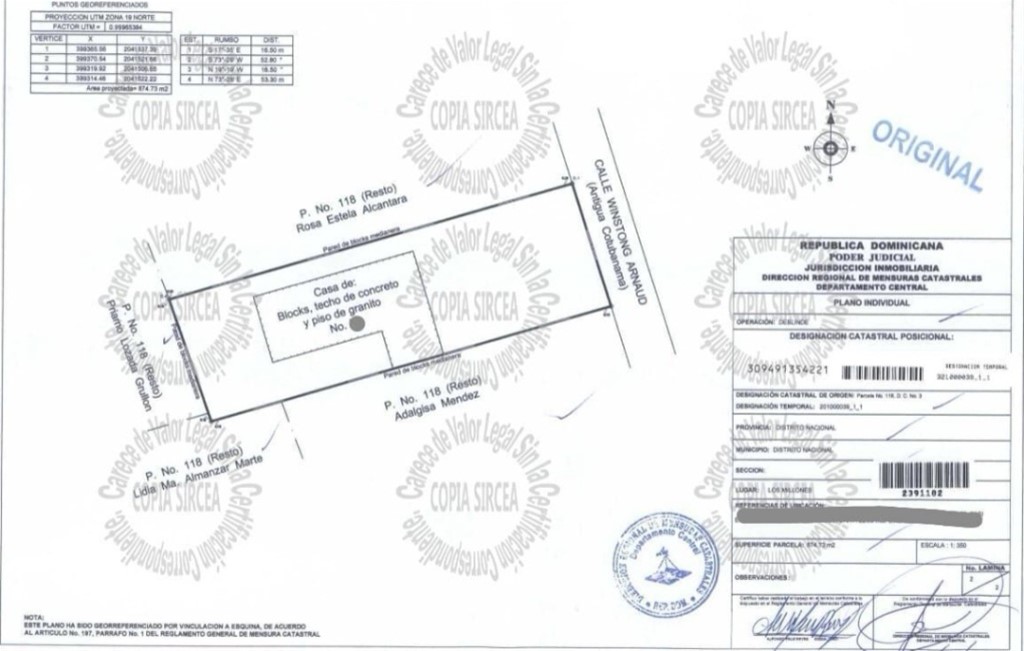 Amplio terreno en venta para construcción en El Millón * 874.73 metros cuadrados * 17 metros de frente * Nivelws aprobados 5+1 * Excelente ubicación * Zona residencial * Título al día * Servicios básicos de agua potable y electricidad PROYECCIÓN UTM ZONA 19 NORTE FACTOR UTM = 0.99965384 VÉRTICE X Y 1 399385.56 2041537.39 2 399370.54 2041521.66 3 399319.92 2041506.65 4 399314.46 2041522.22 Área proyectada = 874.73 metros cuadrados Precio: US$874,000 Sugeiley Ozuna 809-885-0795 Kw Capital