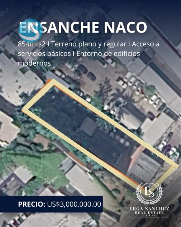 Excelente TERRENO de 854mts2 en el corazón de NACO | OPORTUNIDAD ÚNICA PARA DESARROLLO INMOBILIARIO Terreno de 854mts2 / 14.32mts2 de frente IDEAL Para desarrollo de torre residencial, oficinas corporativas, plaza comercial o proyecto mixto en un entorno urbano, consolidado y altamente cotizado. CARACTERISTICAS DEL TERRENO: Superficie: 854mts2 Terreno plano y regular Acceso a todos los servicios básicos Entorno de edificios modernos Zona de alta densidad y crecimiento constante VENTAJAS DE INVERSION: Alta plusvalía garantizada Excelente proyección de rentabilidad Zona con fuerte demanda comercial y residencial A pocos minutos de avenidas principales, centros comerciales y empresariales PRECIO:US$3,000,000.00 #KL