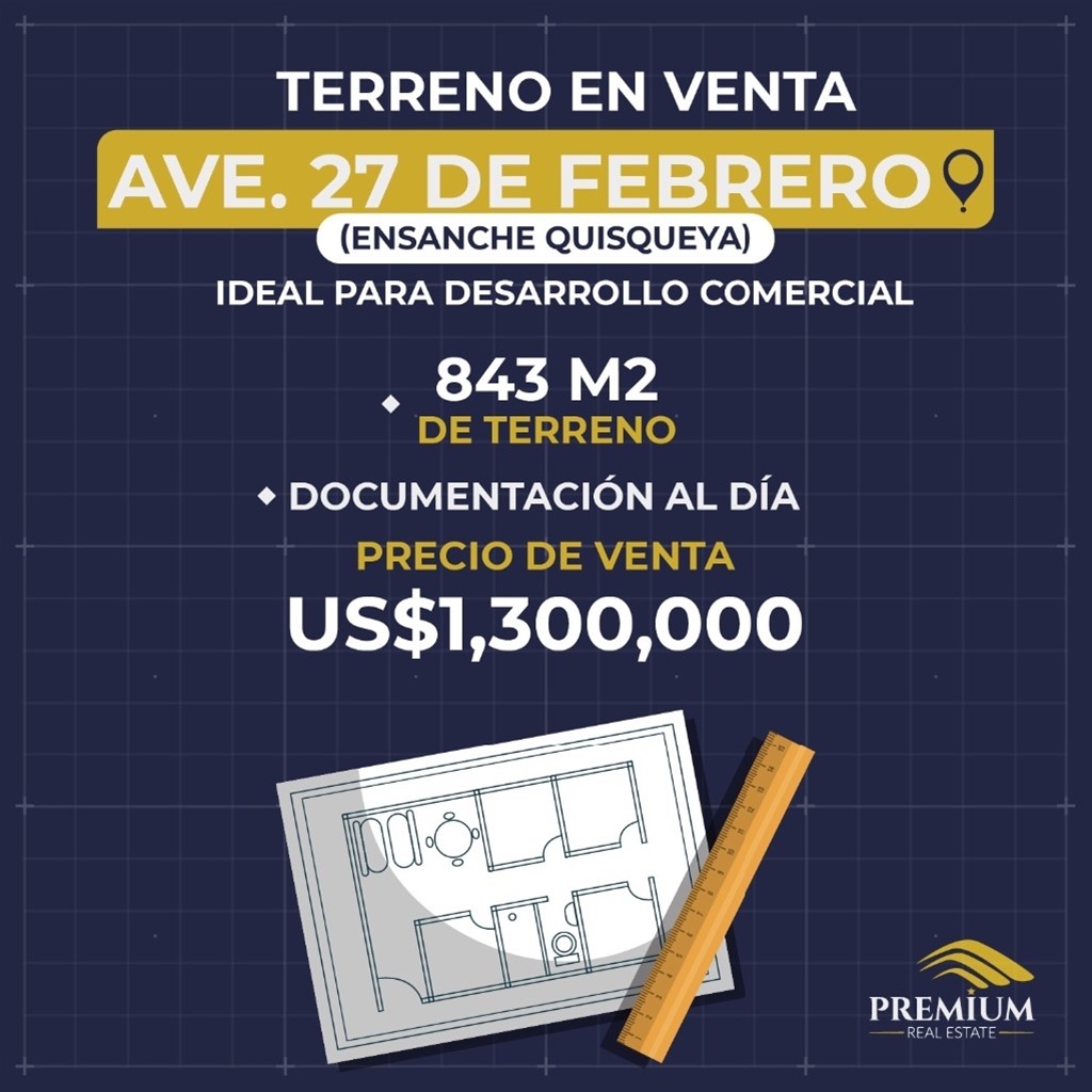 Terreno en la misma Ave. 27 de Febrero?? (Ensanche Quisqueya) ??Ideal para desarrollo comercial. ??843 m2 de terreno. ??Documentación al día. ….. ??Precio de venta; US$1,300,000