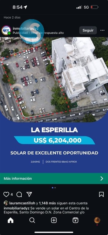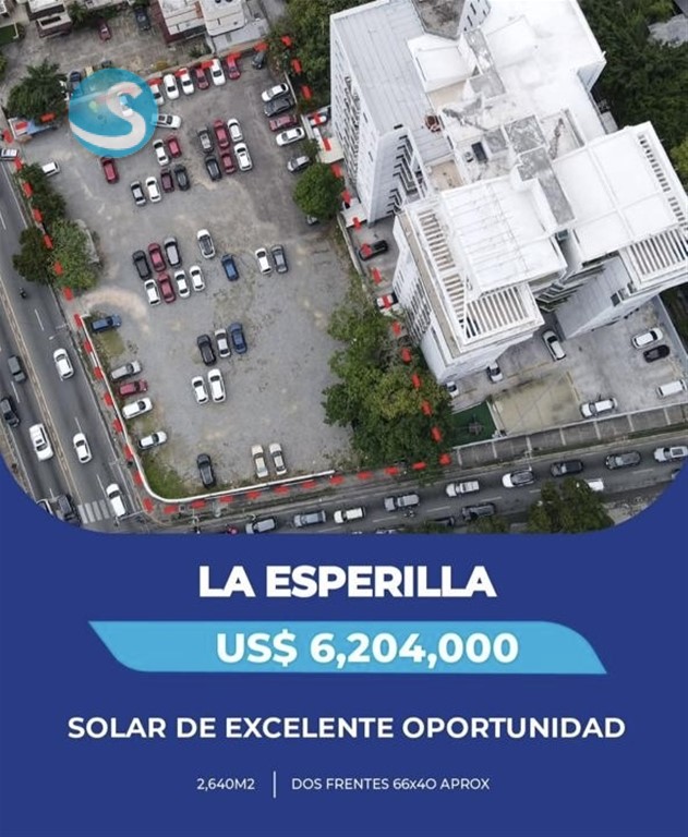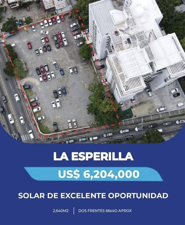Agente Mayka Estrella / esteban Metros 2,640 Mtros2 Precio x M2 2,350.00 dólares x M2 Sector Esperilla Se vende un solar en el Centro de la Esperilla, Santo Domingo D.N. Zona Comercial y/o Residencial. 2,640 Mtros2 , Con dos frentes: 66 x 40 M2 aproximado Permiten alturas hasta más de 15 Niveles. Atención inversionistas, desarrolladores y/o empresas, es la Oportunidad Única en el Corazón de La Esperilla. Su ubicación convierte este Solar en una propiedad privilegiada en el Distrito Nacional. Posee la categoría de zona mixta: Comercial y/o residencial, puedes construir Edificio corporativo o torre de lujo residencial, ideal para proyecto de alto perfil, Justo en avenidas principales. Precio x M2 2,350.00 dólares x M2 Precio Total: 6,204.000.00 us precio Seis Millones doscientos cuatro mil dólares